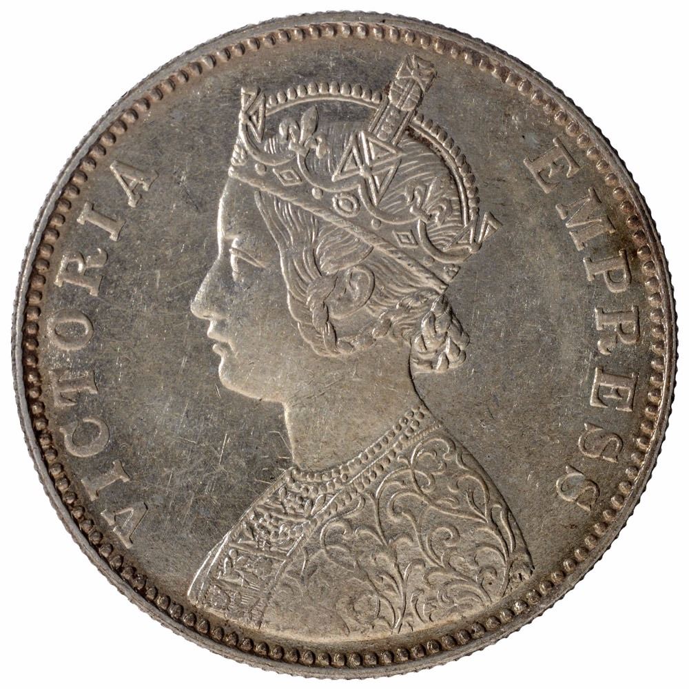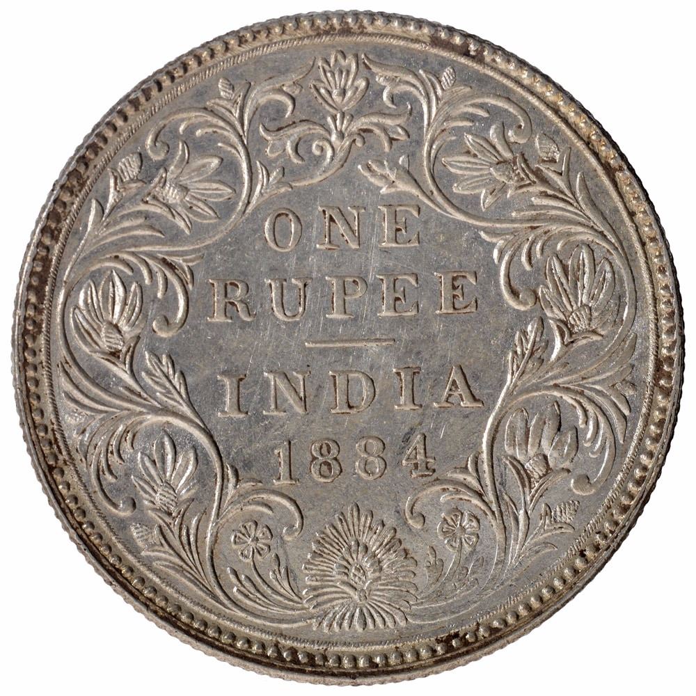 Silver One Rupee Coin of Victoria Empress of Bombay Mint of 1884.