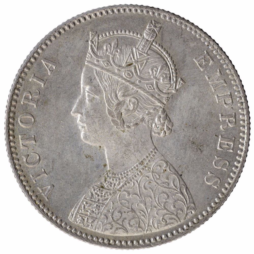 1885,Victoria Empress,Silver Rupee,Bombay Mint,A3/II/B raised, (PR # 168),almost UNC,Scarce.