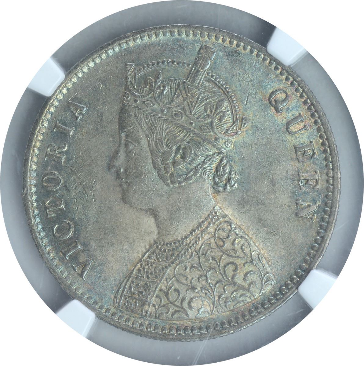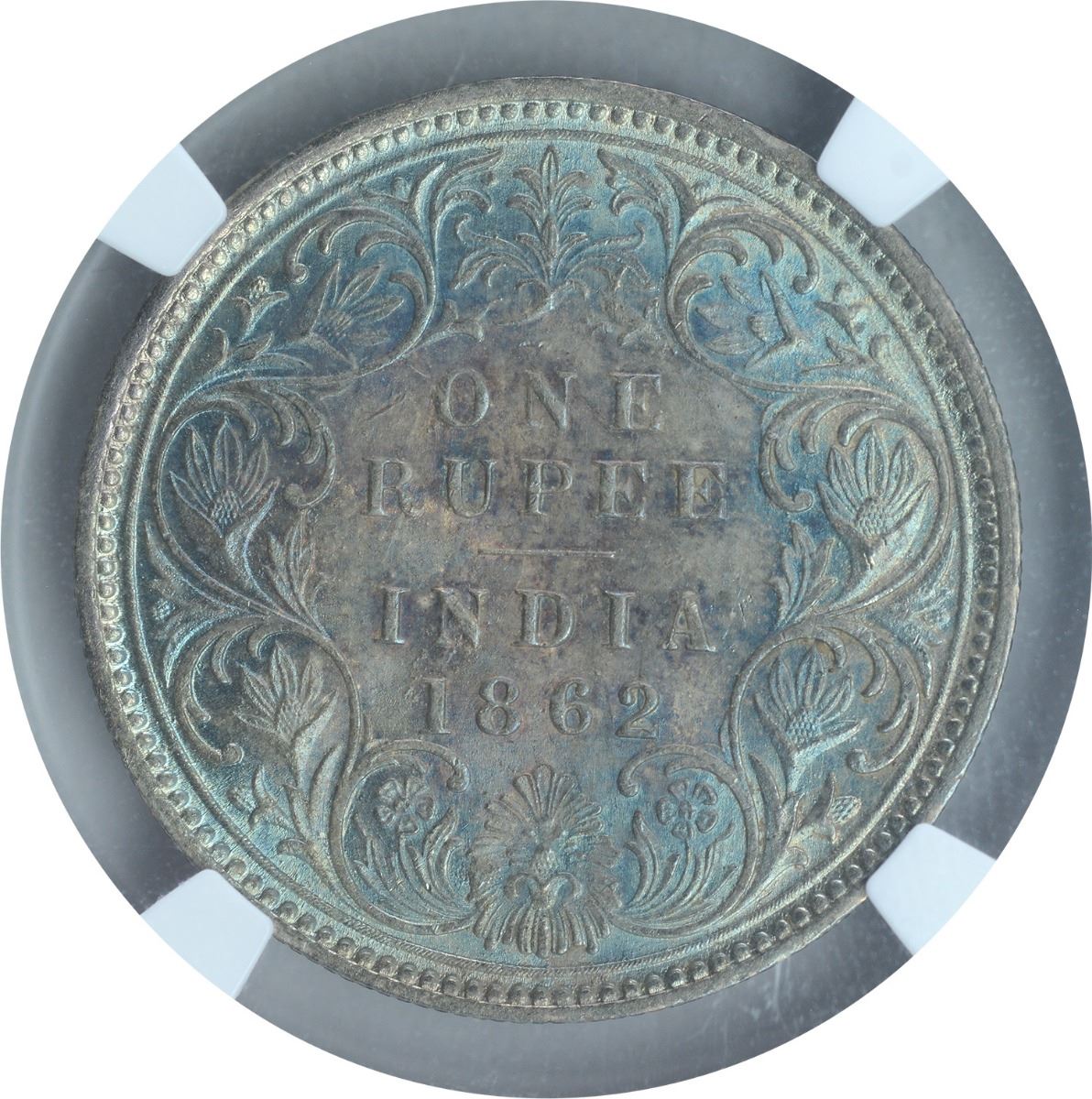 1862, Victoria Queen, Silver Rupee, Bombay Mint, A/I/0/0 Dots, (PR # 66), graded slabbed by NGC as MS 63, lovely toning.