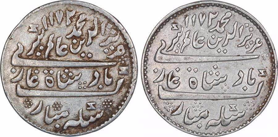 Madras Presidency, ArkatMint,Silver Rupee (2),AH 1172/6 RY,In the name ofAlamgir II,Obv:sikka mubarak badshah ghazi,Rev:sana julus zarb at bottom,11.75g, 11.85g 27.91mm, 28.03mm, (PR # 251),about very fine.