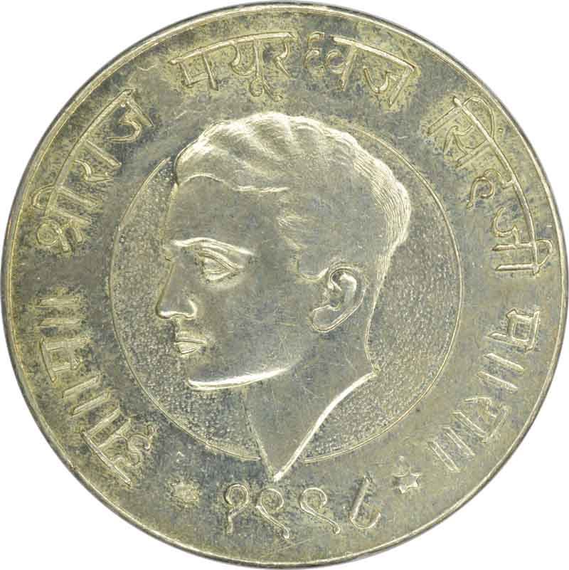 CIS-Dharangadhra, Mayurdhwaj Singh, Silver Rupee, 1998 VS, Obv: ruler portrait around legend, Rev: crown, symbols around state name, 14.8g, 31.87mm, about extremely fine, Rare.
