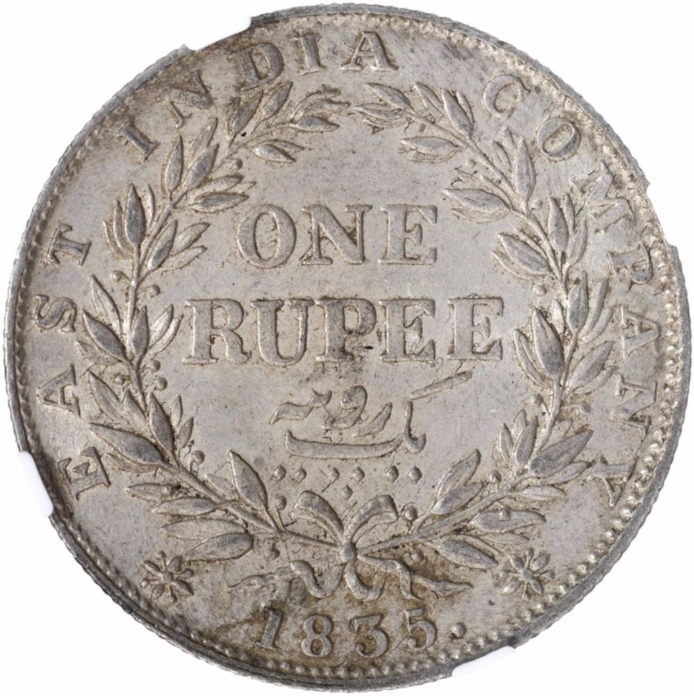 1835, King William IIII, Silver Rupee, Calcutta Mint, F dugout incuse, 19 berries (10L + 9R), (PR # 34/SW # 1.39), A(a)/III, (GK # 21),graded slabbed by NGC as AU 58,