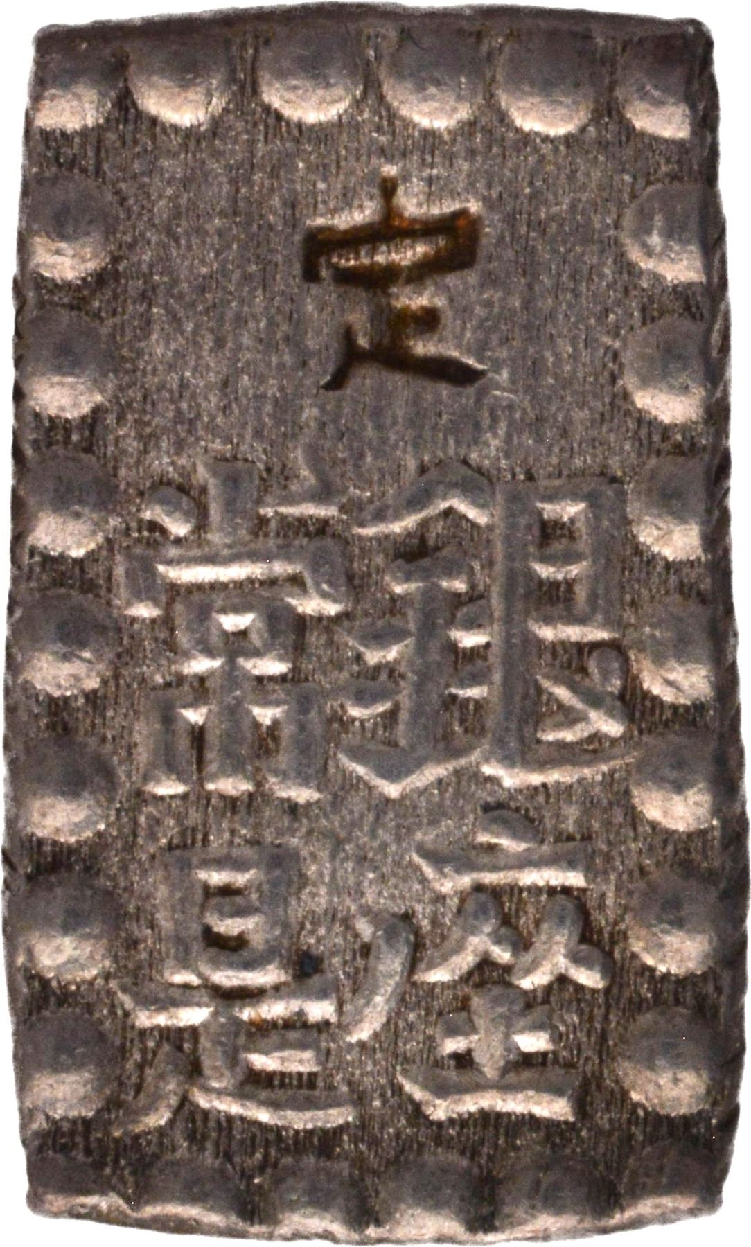 Japan, Komei (1846-1867 AD), Silver 1 Shu, Obv: an incuse stamp 定 over 4 characters in pearl border, Rev: denomination, consists of 3 vertical characters in pearl border, 1.74g, 9.30x15.42mm, (KM # C12), almost uncirculated, Scarce.