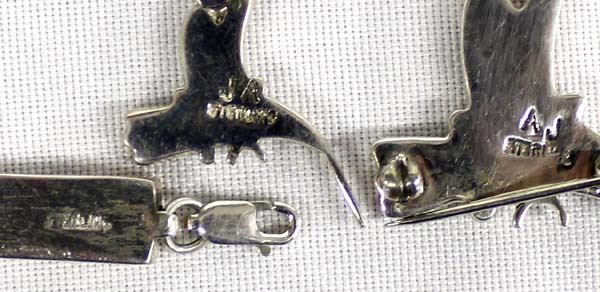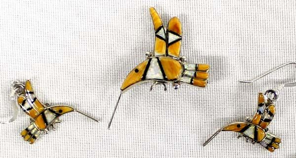 Beautiful Sterling Silver Orange Shell, Opal, and Jet Hummingbird Bracelet, Earrings, & Pin, link bracelet measures 8 3/8''L end to end x .25''W and is stamped sterling, pin measures 1.5''L and is stamped sterling, earrings measures 1.5''L which includes wire and are stamped sterling, 24.87g in total wt.