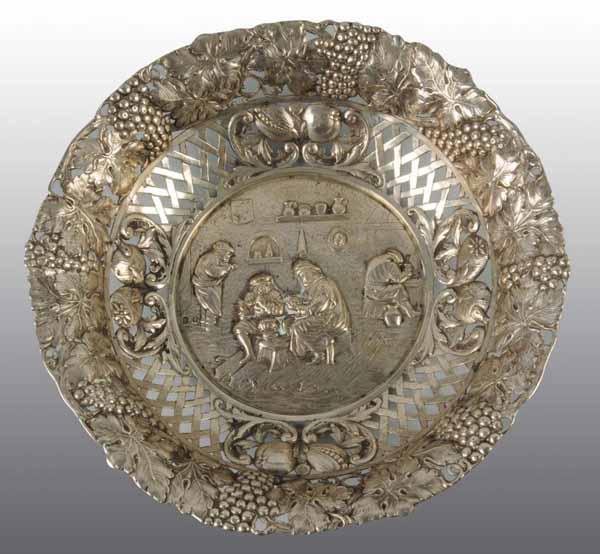 Description Weighs 10.6 troy ounces. Makers marks possibly reads "Selva". Bowl depicts four men drinking and smoking with quite detailed open lattice work. Condition (Excellent). Size 8 - 1/2" Dia.