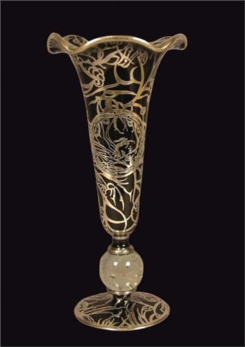 Silver Overlay Black Glass Vase. Mint condition. 8 3/4 inches tall