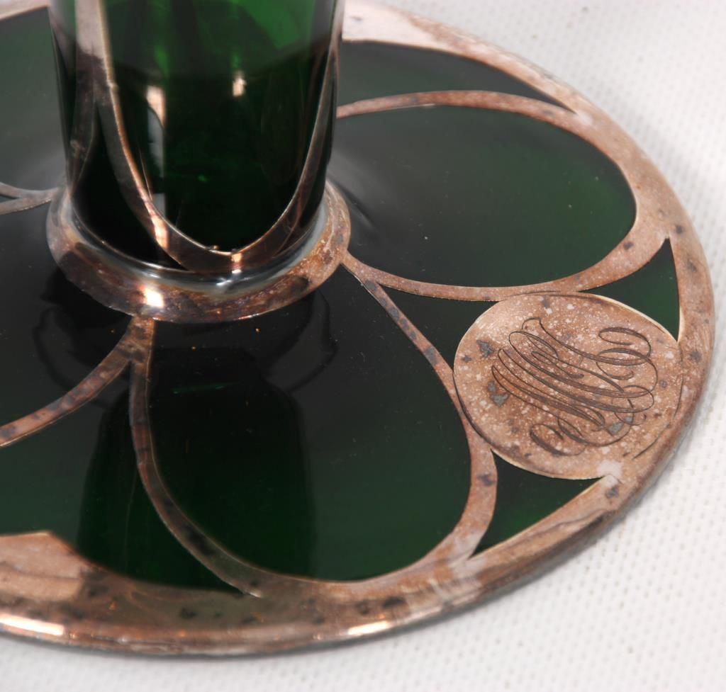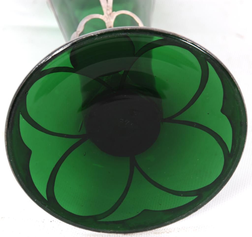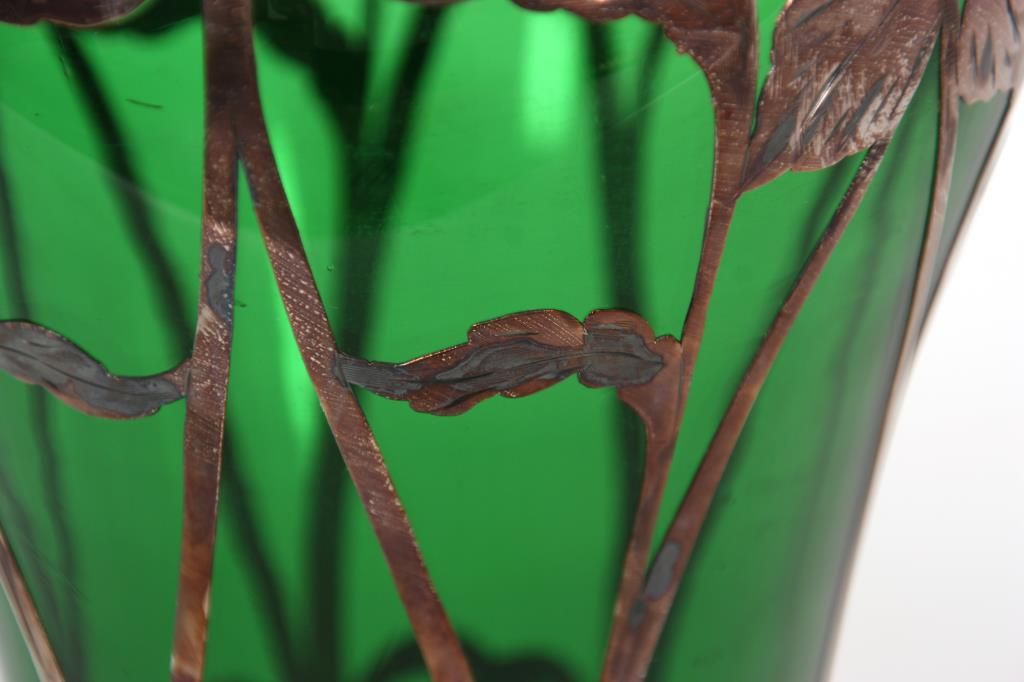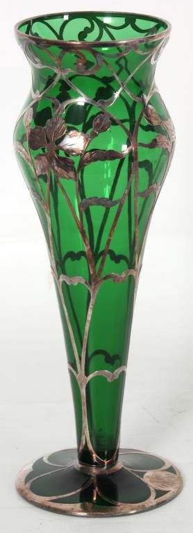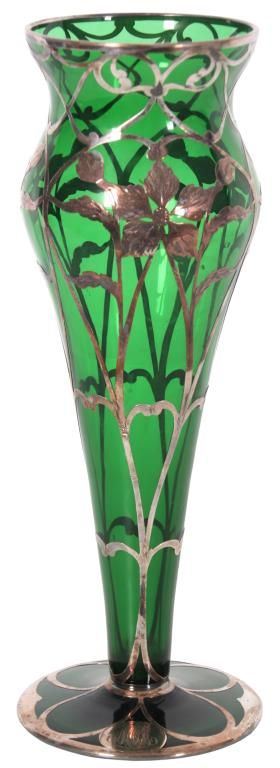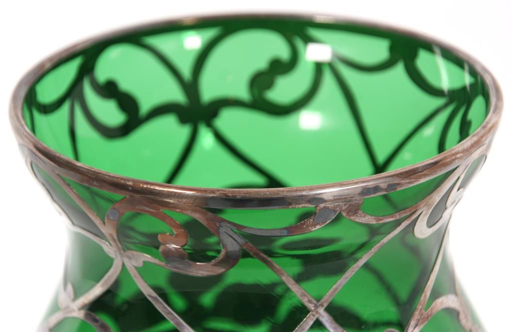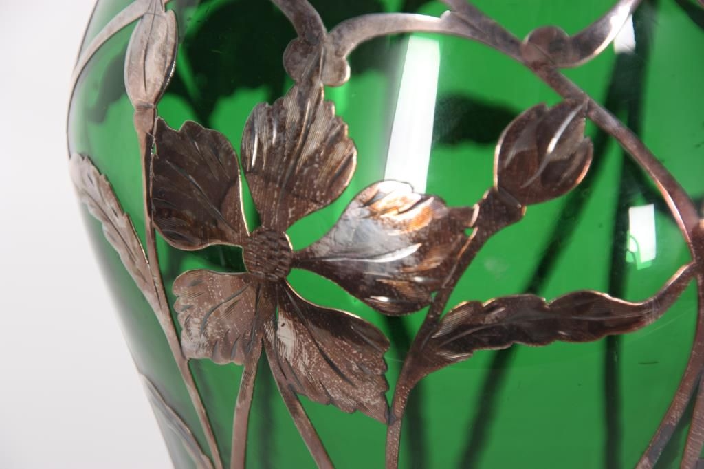 Silver Overlay Floriform Vase. Emerald green glass vase has a flowering form with tapered stem and round foot, overlaid with pierced and etched 999-1000 fine sterling silver in a floral and stem design; round tag with monogram on the foot reads M.C.A. Marked on the base 999-1000 Fine Sterling. In very good condition with no pulling or losses to the silver, no cracks, chips, breaks or repairs to the glass. 14.25 in. high.