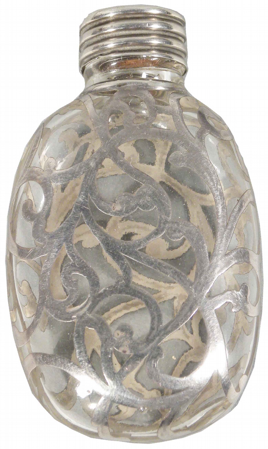 Silver Overlay Glass Flask. Monogram on top. Excellent condition. 3 inches tall.
