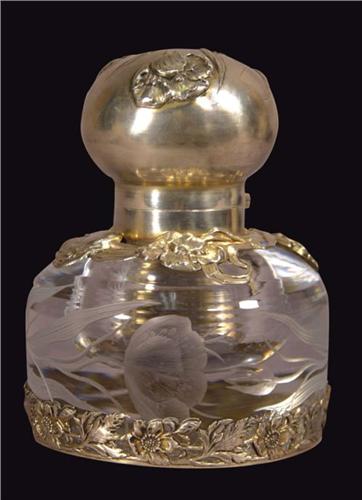 Silver Overlay Etched Glass Inkwell with floral pattern. No chips or cracks. 5 inches tall.