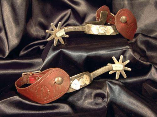 Silver Overlay Double Mount Spurs, unmarked. Leathers by Mel Parker Amherst, NB. Very good condition.