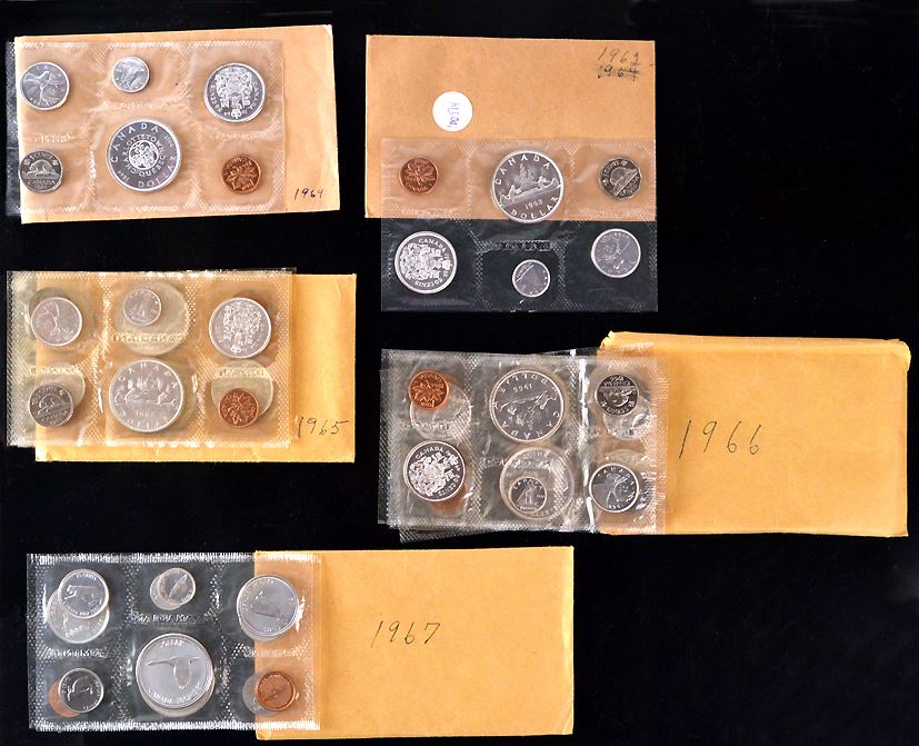 Silver Prooflike Sets, 1962; 1964; 1965, (3); 1966, (4); 1967, (2); In original pliofilm, 1965 sets cloudy; Total of 11 sets