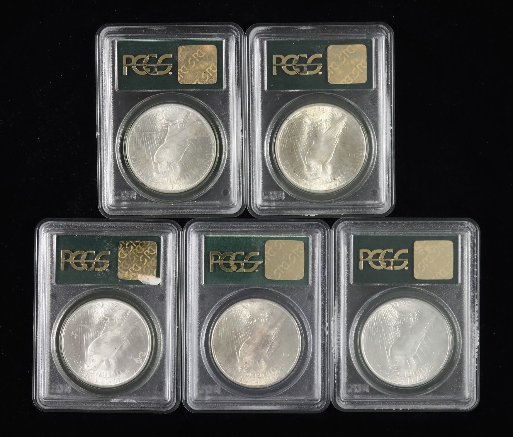 Lot of 5 U.S. Peace Dollars, all are PCGS graded MS 64, Includes 1922 (1); and 1923 (4), another attractive and relatively mark free group of coins (5 coins total). Shipping charges apply - weight 1 lbs.