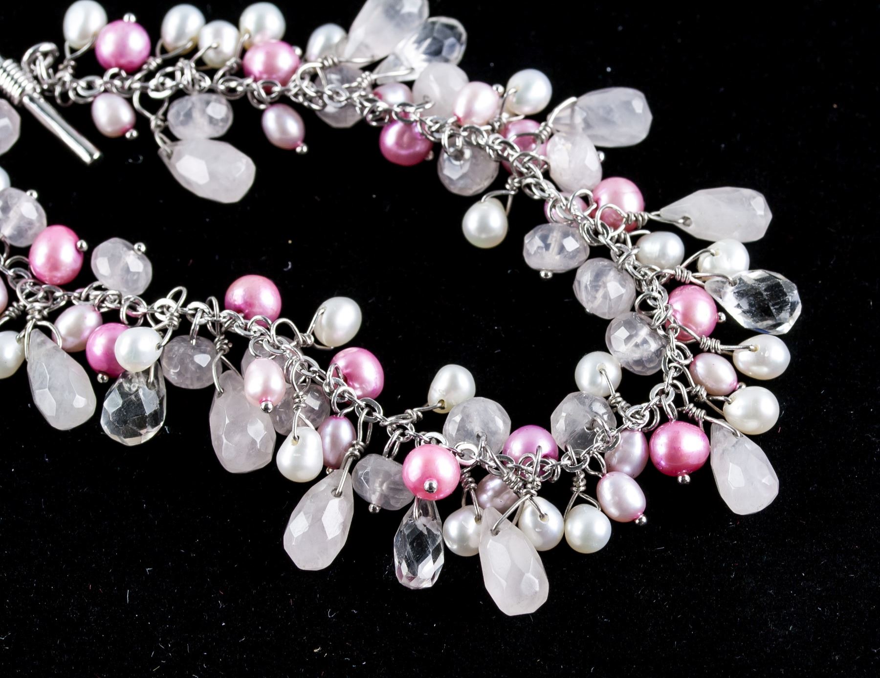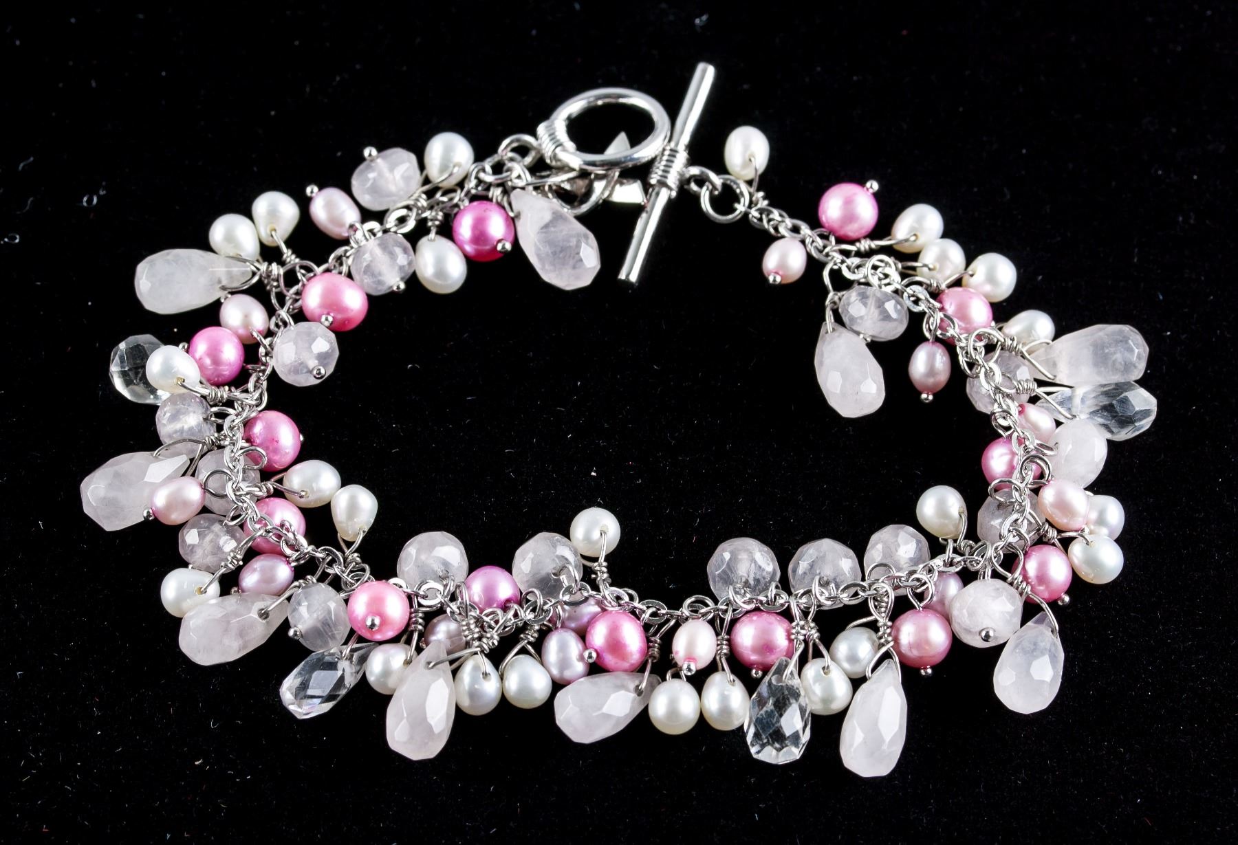 Stamped 925 silver bracelet. Set with fresh water pearls and beads with a pink ribbon charm. Retail value $300.