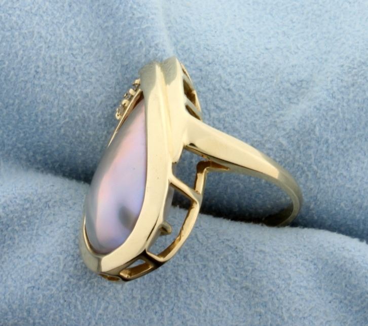 In 14K yellow gold there is a large 20mm tear drop shaped silver colored pearl with fantastic color and luster. It also contains three .01ct diamonds. Size 8 1/4 7.3g