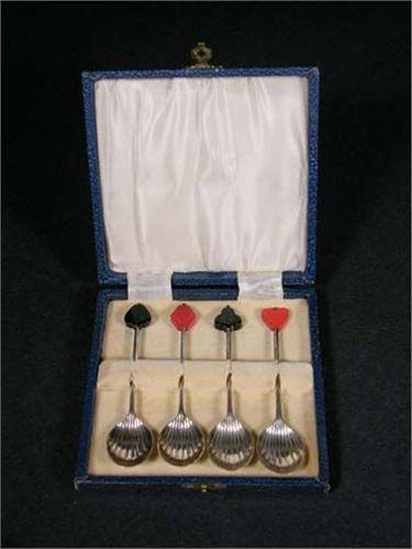 4 silver plate box set sugar spoons with enameled card suit handles, ca. 1900, manufactured Sheffield England, 4"