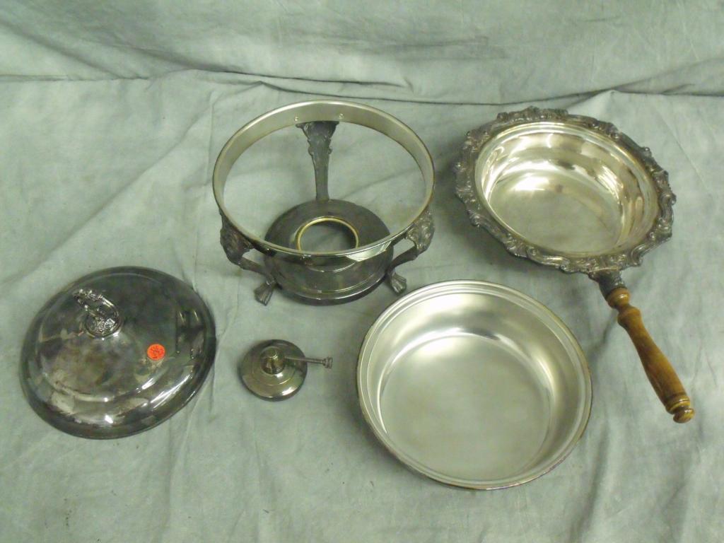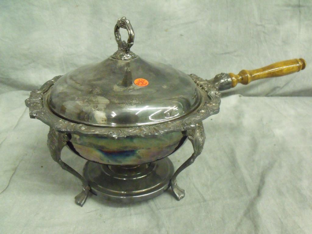 Sheridan silver plate 5 piece chaffing dish with ornate boarder on dish and pedestal. Includes warmer stamped with Sheridan mark wth wooden handle. 12" tall 12" in diameter in good condition.