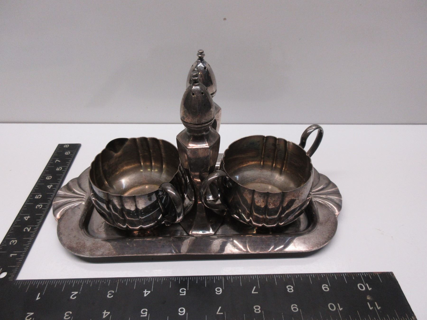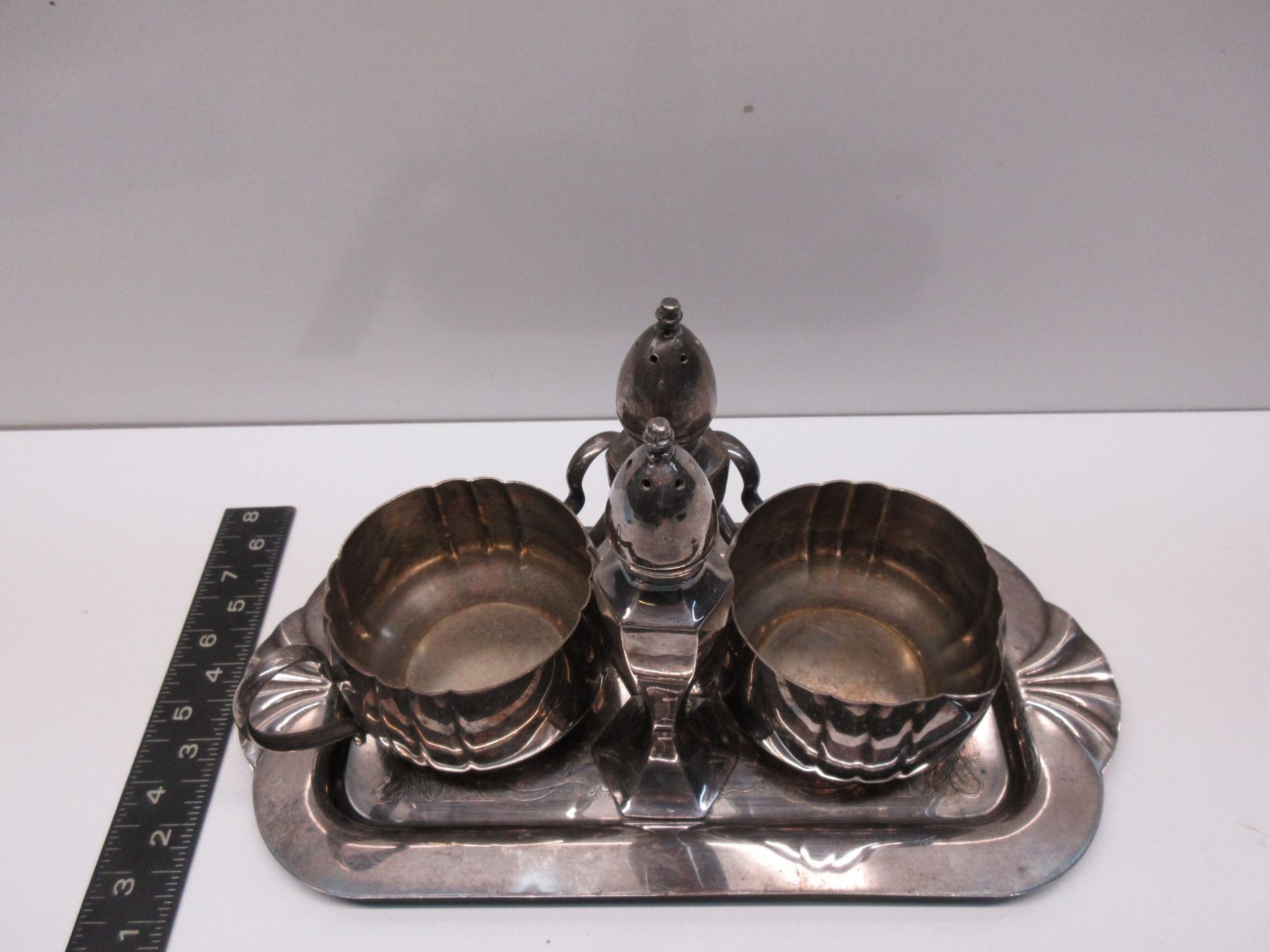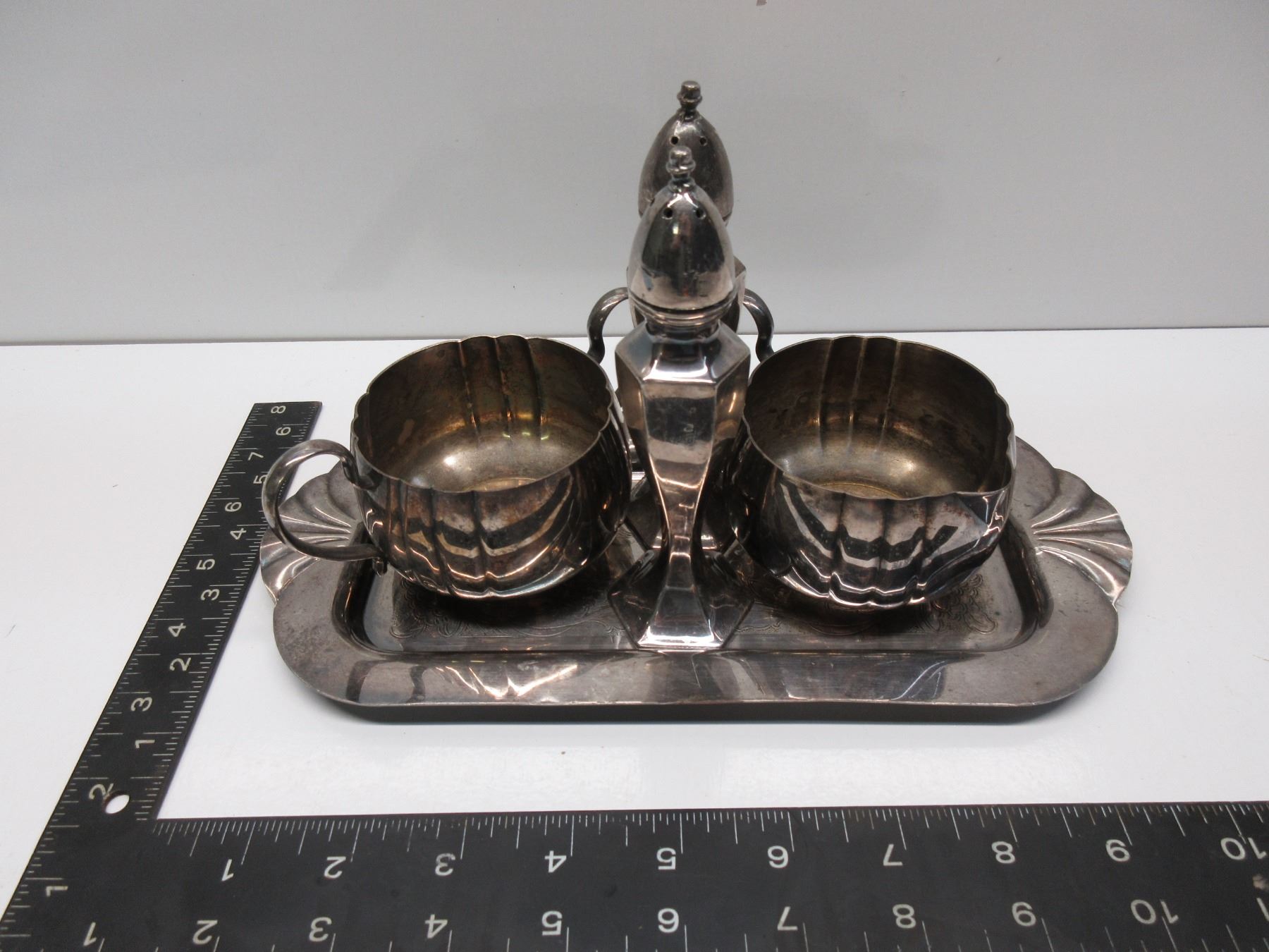 Silver Plate Cream & Sugar, Tray, Salt & Pepper