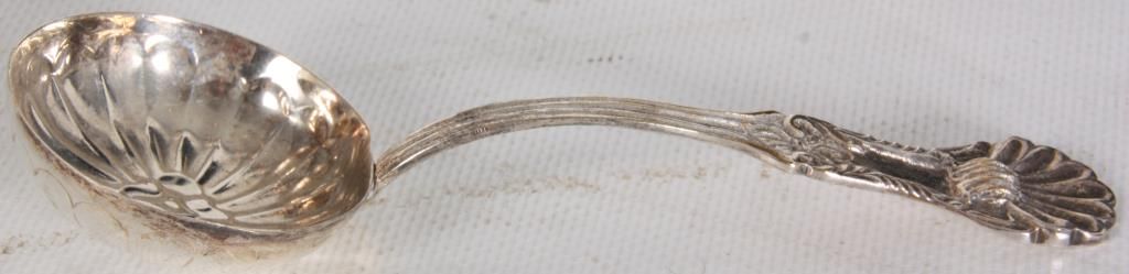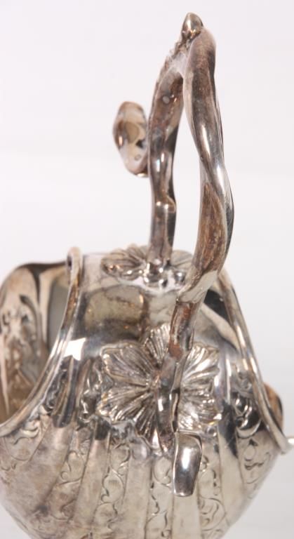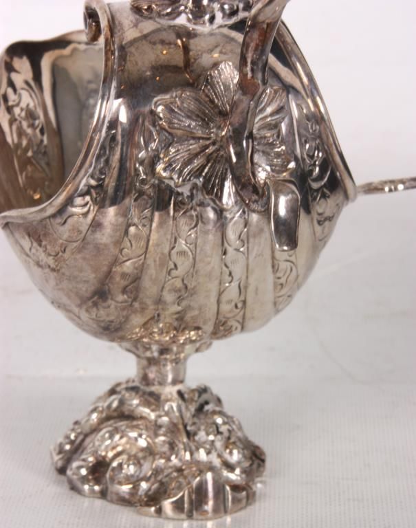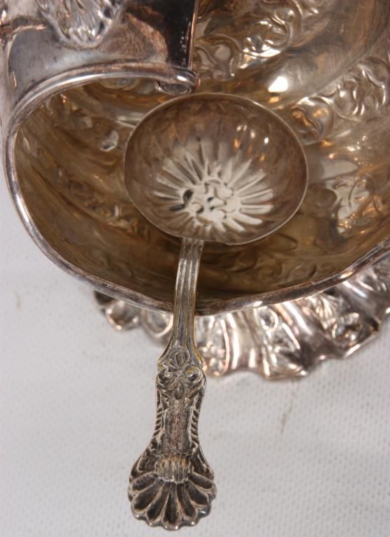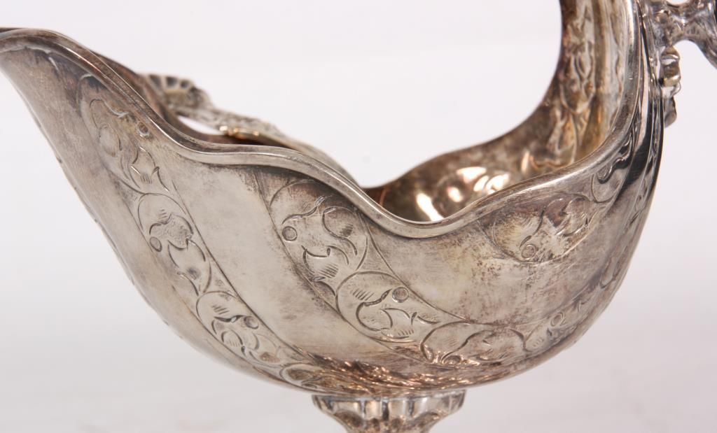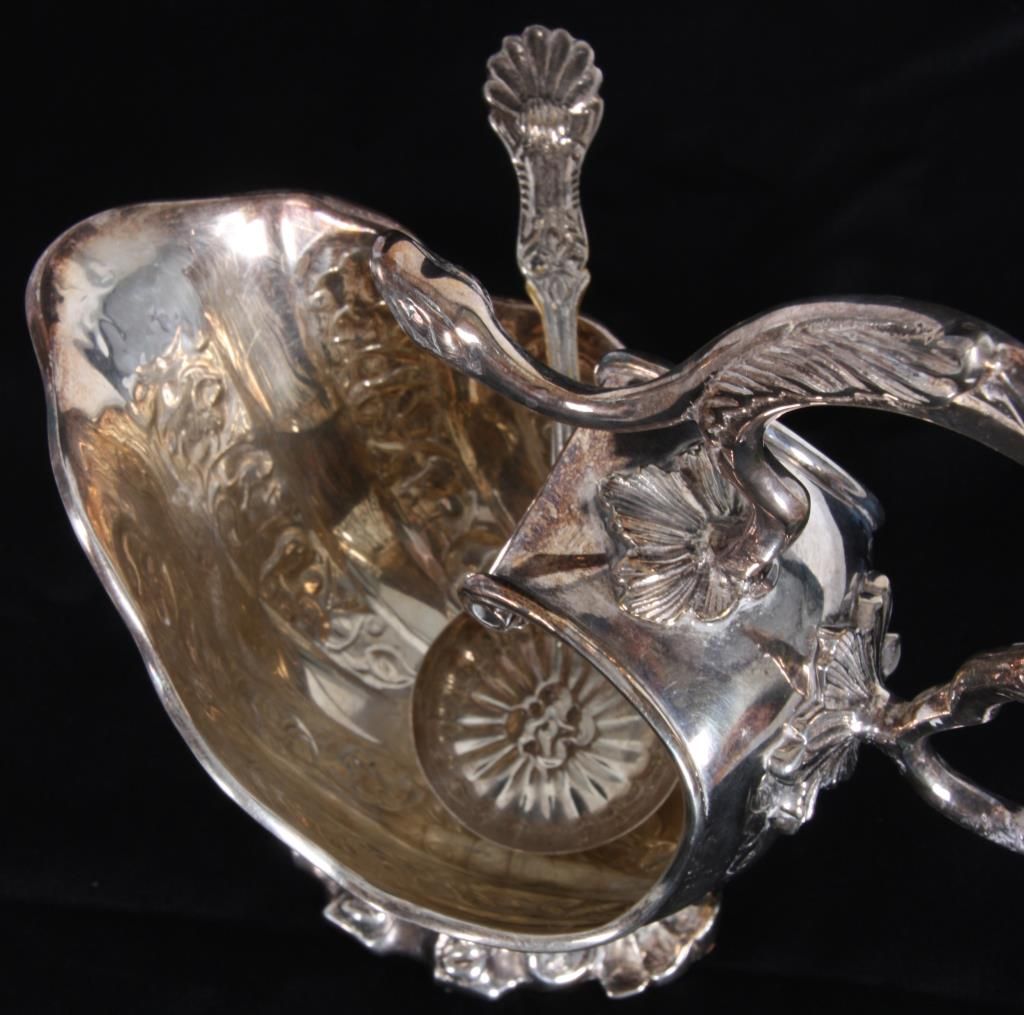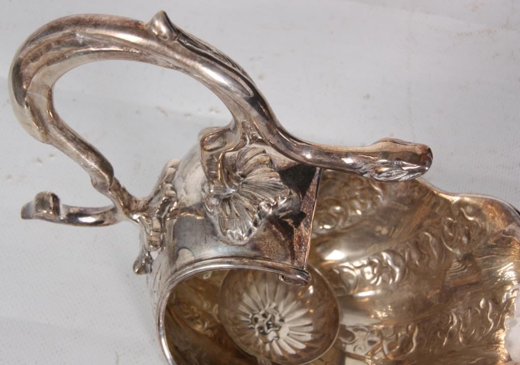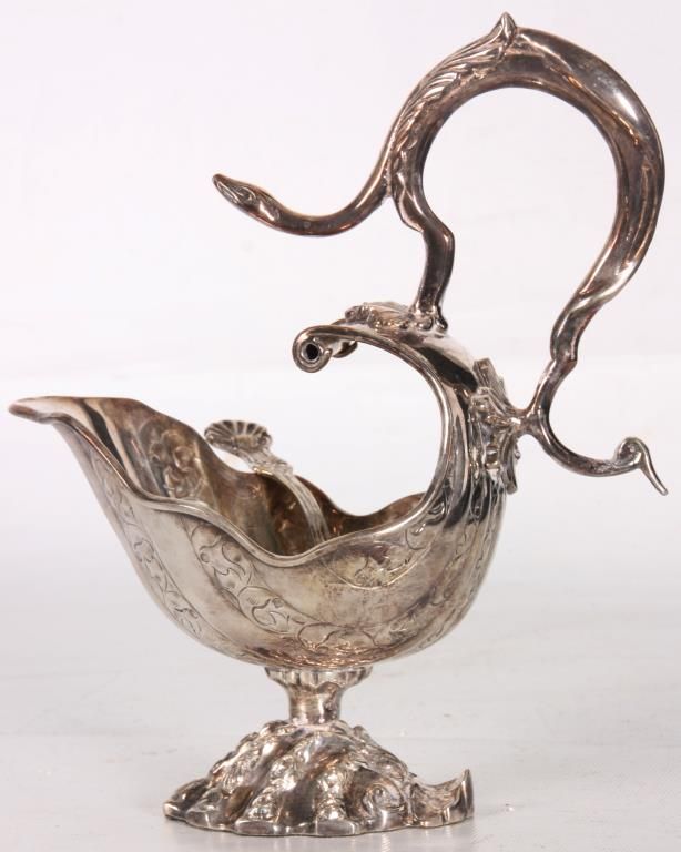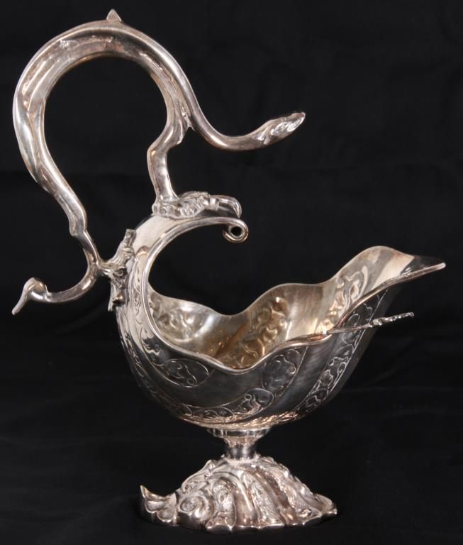 Silver Plate Gravy Boat. Has a flowing shell form with filigree design, the back end curves up over the top with a serpent like handle and snake head on leafy mounts; stands on a weighted base. With a silver plated sauce ladle, unmarked and unsigned. 9 in. high x 7.5 in. wide x 4.25 in. deep.