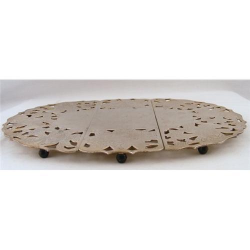 A heavy duty Silver plated Table Top Protector. Made by Raimond Silver. There are 10 original bakelite feet. 10" X 7.1/2" closed.13" X 7.1/2" opened.Not fully cleaned. No damage-No loss of plate.