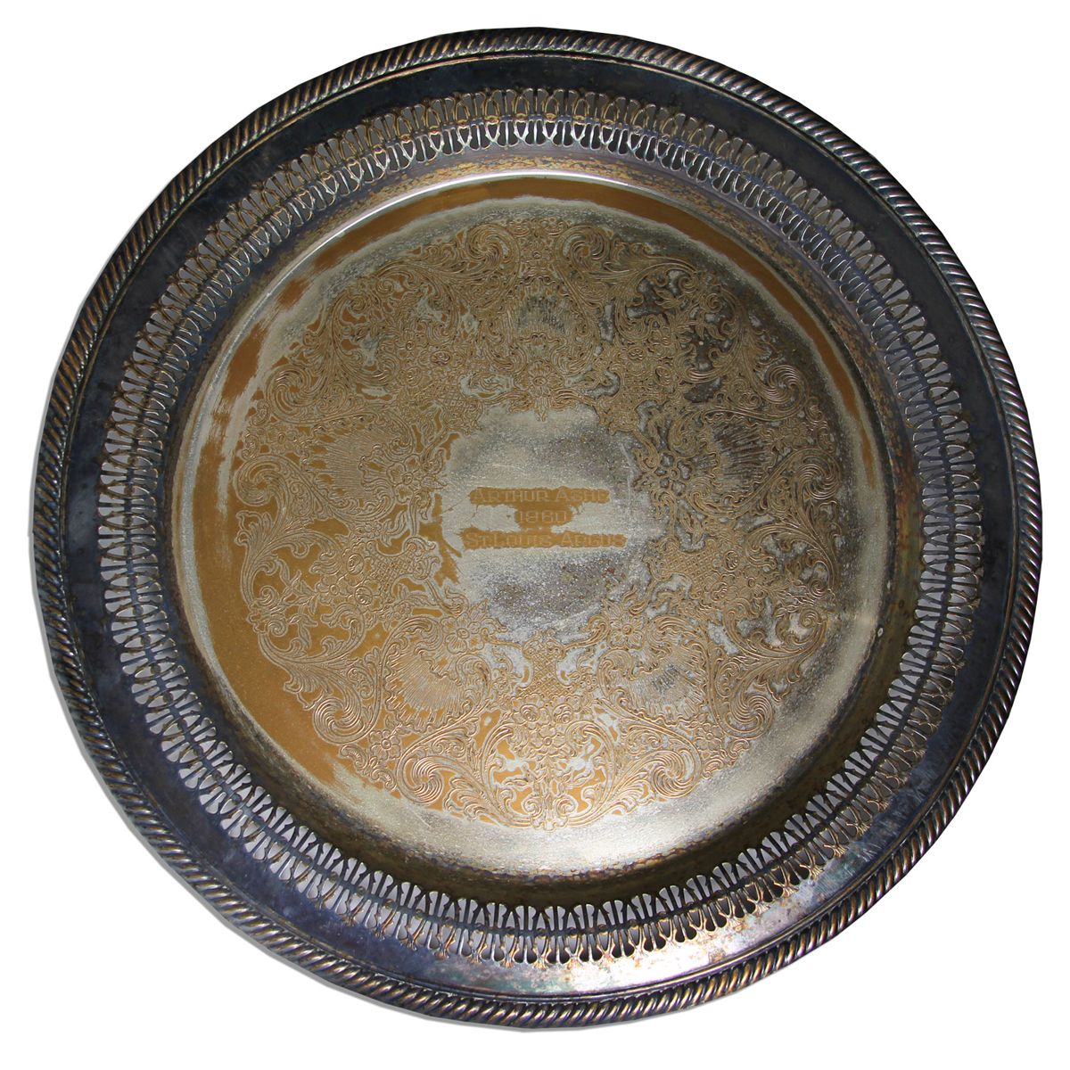 Arthur Ashe's silver plate from Missouri newspaper ''The St. Louis Argus.'' Ashe transferred to Sumner High in St. Louis for greater opportunities in tennis. ''The St. Louis Argus'' publication was founded by an African American family in 1912 for a black audience and remains the city's oldest black business. Beautiful silver plate features a gadrooned rim and openwork band, with intricate floriated design surrounding the engraving at the center: ''Arthur Ashe / 1960 / St. Louis Argus''. Measures 12.25'' in diameter and weighs 15 ounces. Rubbing, tarnishing and discoloration, else near fine. With an LOA from Arthur Ashe's widow.