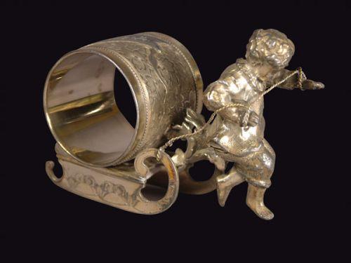 Silver Plate Napkin Ring with boy pulling sled. Wilcox Silver Plate Co., Meriden, CT. mfg #01576. Good condition. 4 inches long.