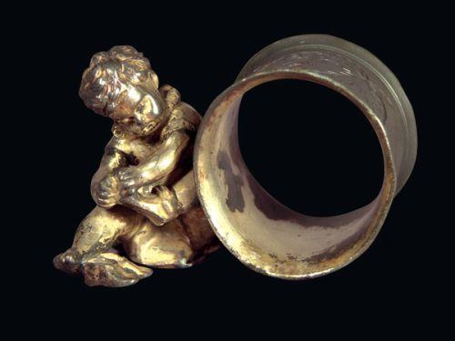 Silver Plate Napkin Ring with boy holding his foot. Derby Silver Co. Derby, CT. Some silver loss otherwise good condition. 3 1/4 inches long