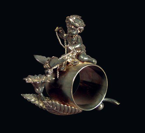 Silver Plate Napkin Ring with cherub, butterfly and flower, monogram EDA. Mfg #021, no stamp. Some silver loss otherwise good condition. 4 inches long