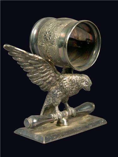 Silver Plate Napkin Ring with eagle and #2 engraved on top. Meriden Co., Meriden, CT. mfg #203. Some silver loss otherwise good condition. 3 1/2 inches long X 4 inches tall.