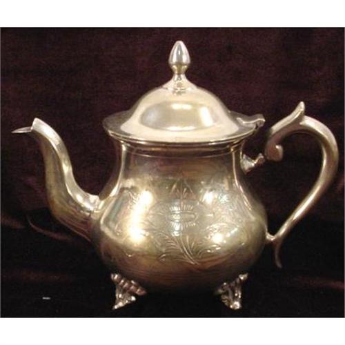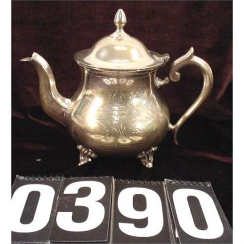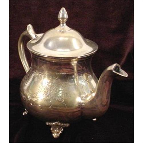 Nice silver plate tea pot with beautiful etched designs but no makers mark 6-1/2" high in very nice condition. aprox 10" x6" x8" 2lb.[91]