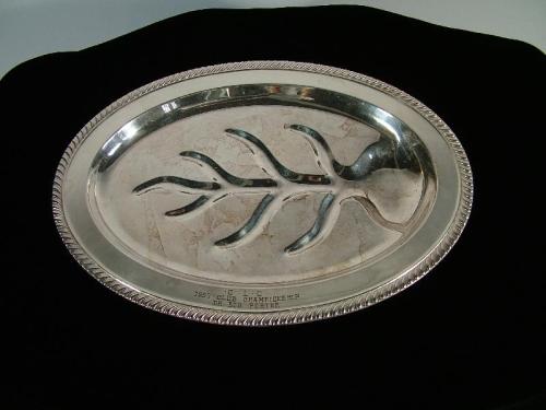 Silver plate rectangular tray from Germany, no stamp found. 12" by 7 1/2" by 1 1/2"; Silver plate oval platter with legs and a branch motif in the center, stamped 647 EPC 16" by 11 1/2" by 1 1/2"