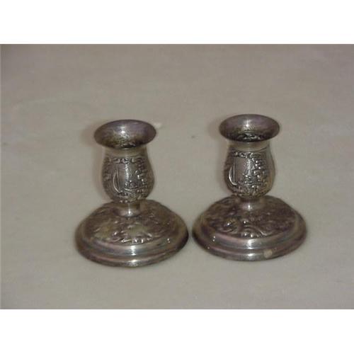 Silver Plate candle sticks. Unreadable hallmark. (Probably Dutch) 2 5/8" in diameter x 2 5/8" tall. Scenes of boats and windmills in relief on base and stem. Weighted with cement.