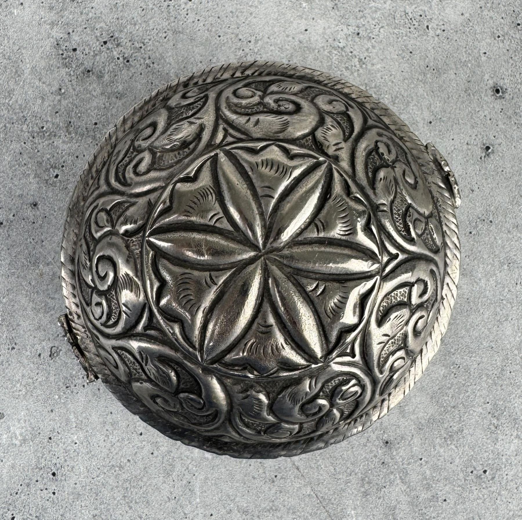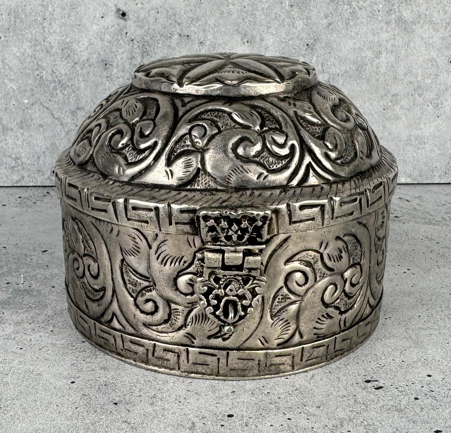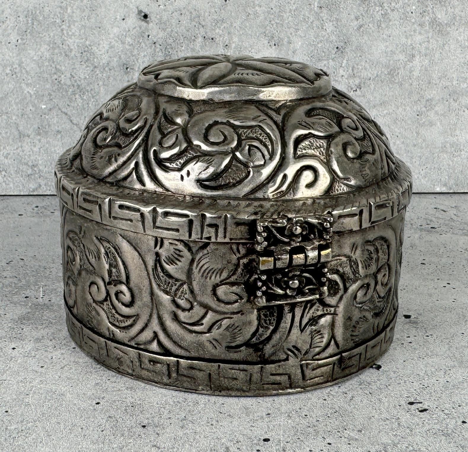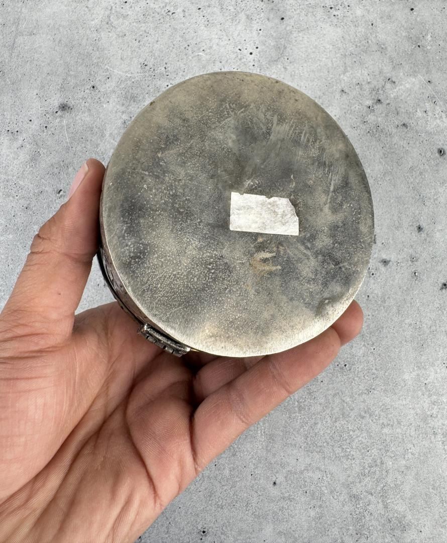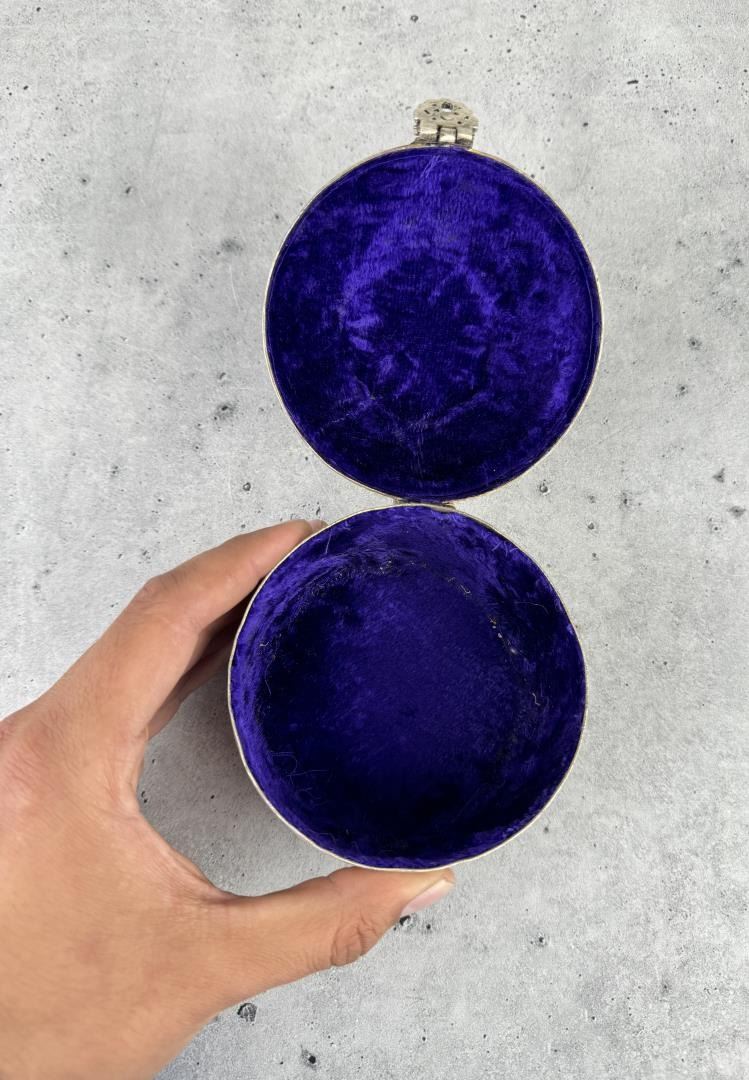 Blue velvet lining. 3" tall by 3 3/4" in diameter.