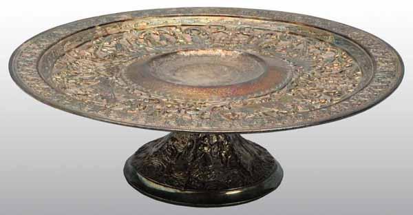 Description By Derby Silverplate Company. The rim, border, and center are chased with foliage and figures at work within scrolls. Condition (Good). Size 11 - 7/8" Dia.