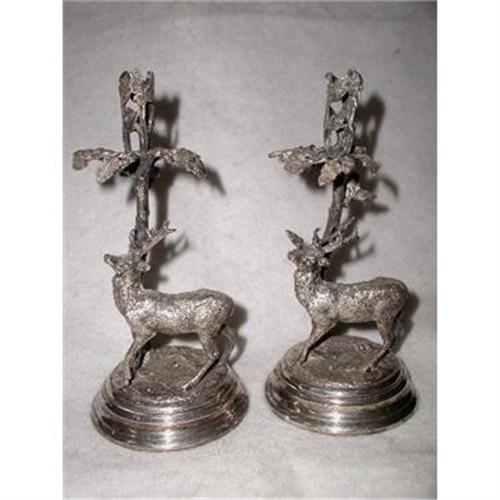 </font></strong>Highly decorative and rare Walker and Hall 19th century silver plated over brass candlesticks from England. Adorable deer with antlers standing on the thick base under a tree whose upper branches form the candle holder with leaves wrapped tightly around. Would hold a slightly more narrow candle than standard one or a standard could be trimmed. One bunch of leaves has dropped from the tree just behind the deer with a raised base mottled to represent the forest floor. Marked on the bottom with the famous W W & H Co lettering and hallmark, Excellent condition,one very bottom rim right side of deer one inch very slight veering to the left from the rest of the perfect circle. Measure 4.50L X 9.25H X 4.50D.</font>