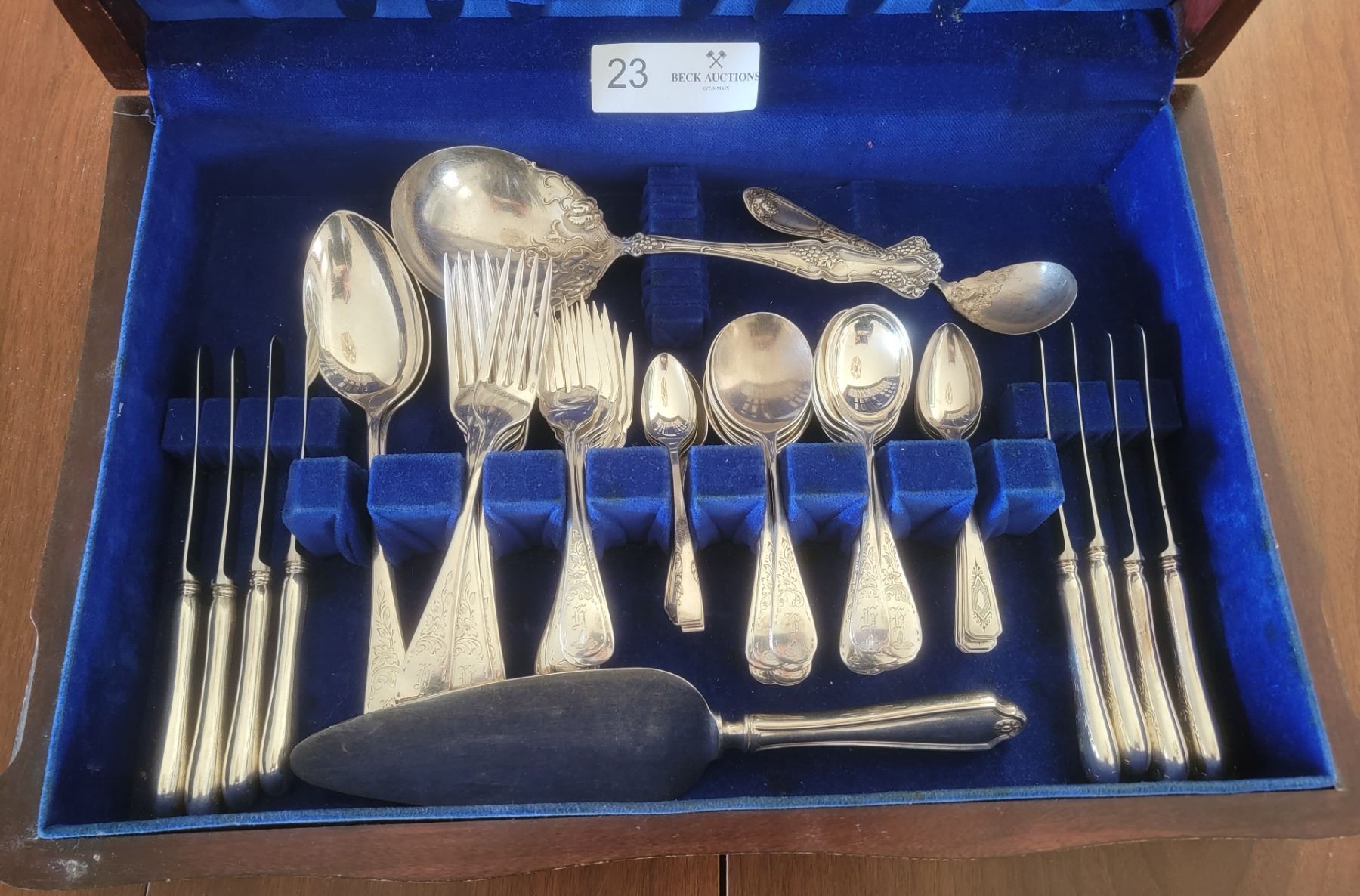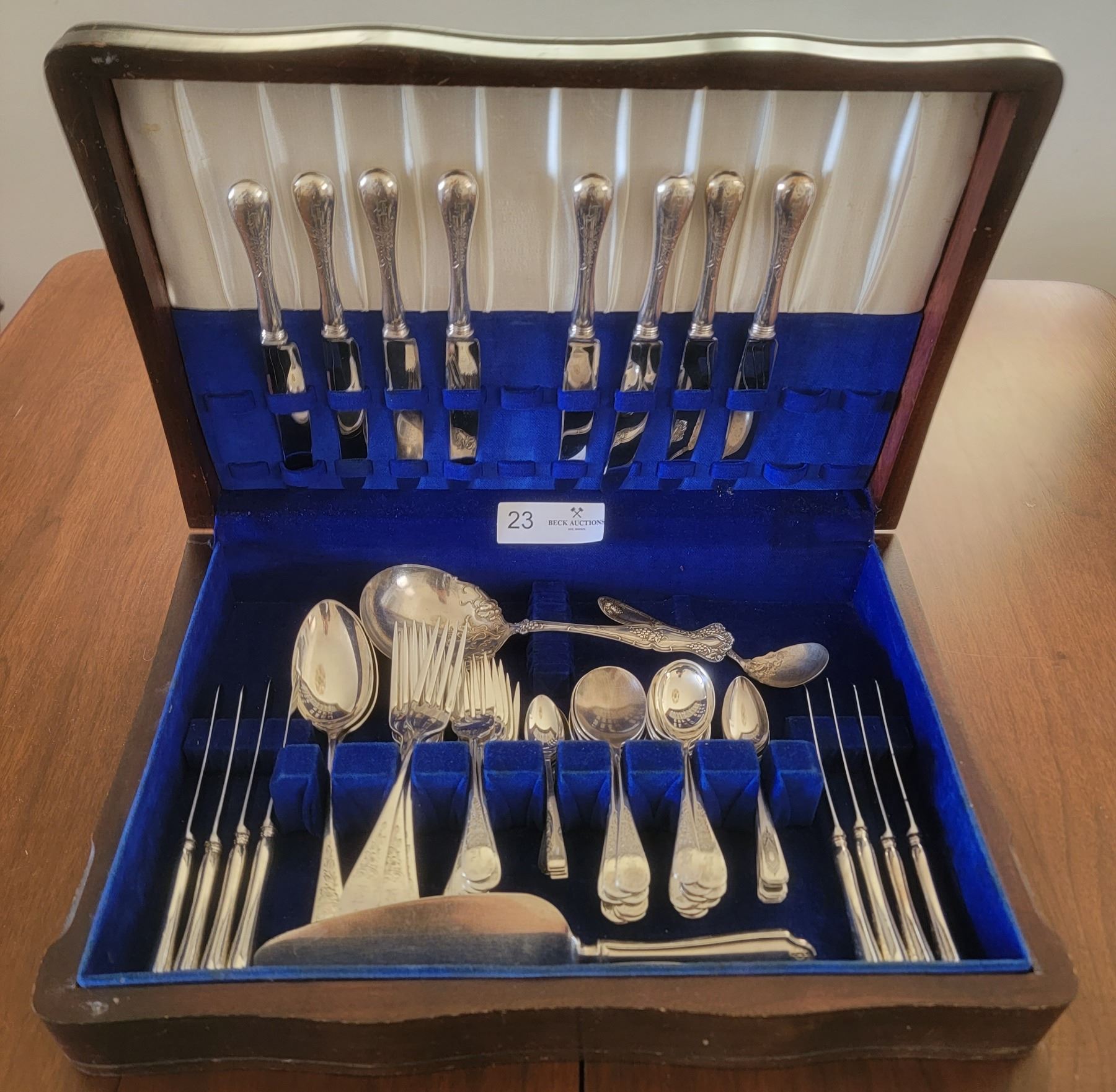 8 Butter Knives, 1 Large Serving Spoon, 8 Spreading Knives, 2 Other Spoons, 8 Dinner Forks, 8 Salad Forks, 4 Dessert Spoons, 8 Soup Spoons, 9 Tablespoons, 6 Teaspoons, 1 Pie Spatula, 1 Gravy Spoon.