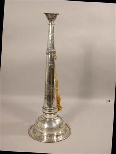 Silver plated fire trumpet, presentation grade, highly engraved with helmet-axe-bucket-trumpet (has not been presented), 23" tall.