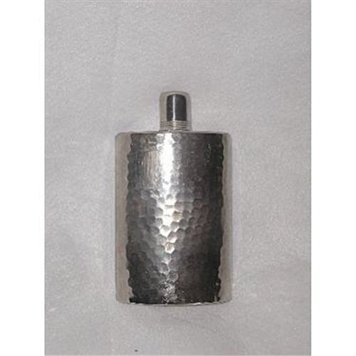 Kidney shaped flask fronm West Germany late 19th century has a hammered silver plate design front and back with a solid panel upper left for engraving the initials of the owner. A jigger screws off which appears as the cap,holding one ounce. The real smaller cap,cork lined is attached below the jigger on one side. Marked on the bottom "Tin-Lined 10 oz. Made in West Germany". In excellent condition with exception to a tiny spot on the center front which reveals a hint of the underlying brass below the silver plate. Measures 7H X 4L X 1.5D. Kidney shaped for breast pocket or hip.