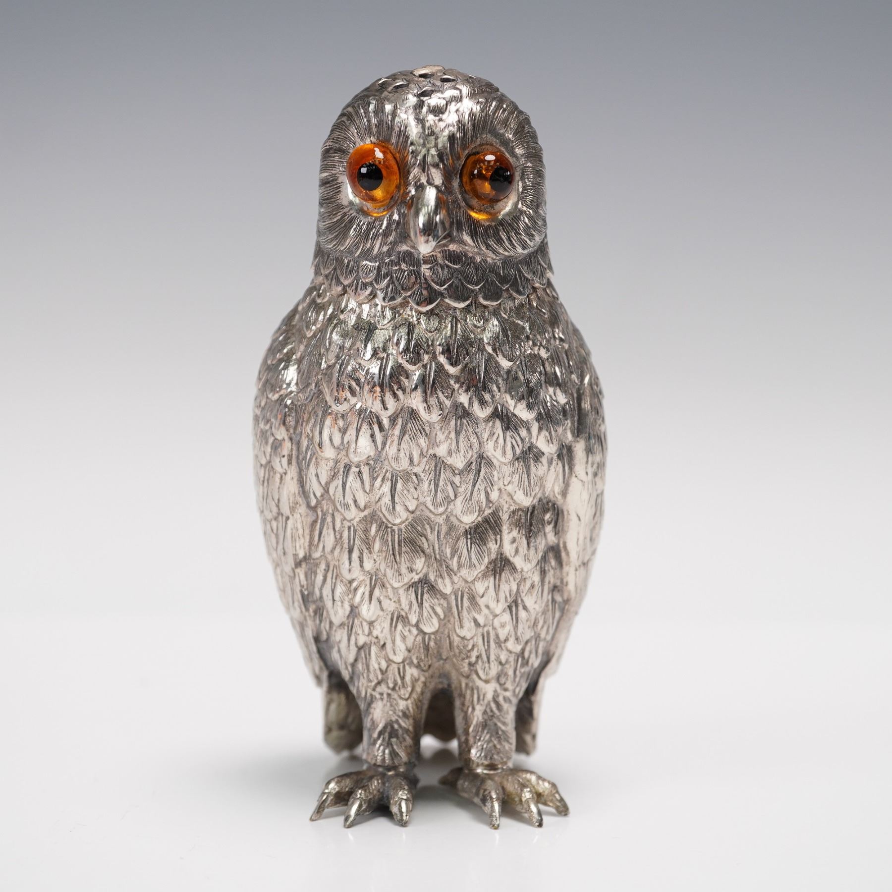 Whimsical silver-plated figural muffineer in the form of a standing owl, finely cast with detailed feathered texture and bright amber-colored glass eyes. The owl's head lifts off to reveal a hollow interior and is pierced at the top for sprinkling, identifying it as a functional muffineer or sugar caster. Marked Corbell & Co. beneath the tail. A charming and unusual example of 20th-century novelty silverplate.
