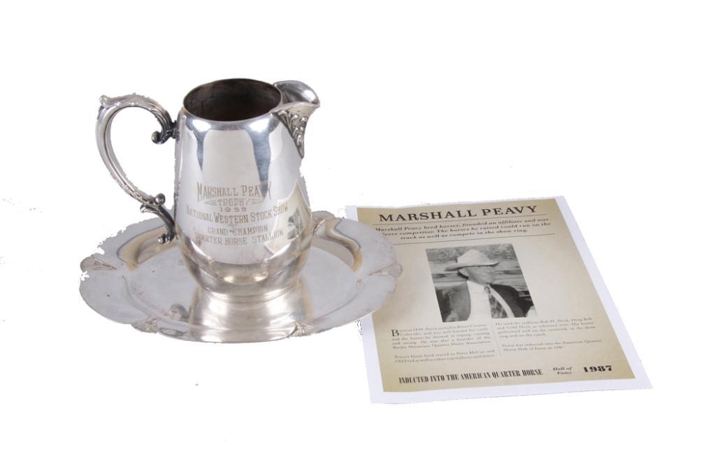 Silver Plated Pitcher and Oval Tray Signed by Wm Rogers and inscribed "Marshall Peavy 1959 National Western Stock Show for Grand Champion Quarter-horse Stallion". A short bio is included on Marshall Peavy, who bred champion quarter horses in ColoradoSigned by Wm Rogers and inscribed "Marshall Peavy 1959 National Western Stock Show for Grand Champion Quarter-horse Stallion". A short bio is included on Marshall Peavy, who bred champion quarter horses in Colorado and was the founder ofthe Rocky Mountain Quarter-horse Association. He was inducted into the American Quarter Horse Hall of Fame in 1987.