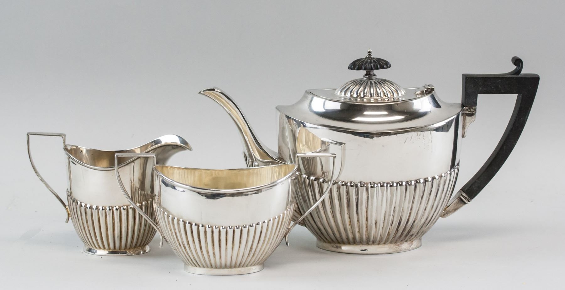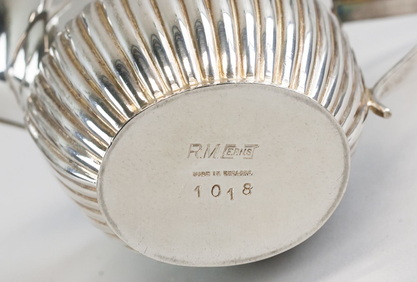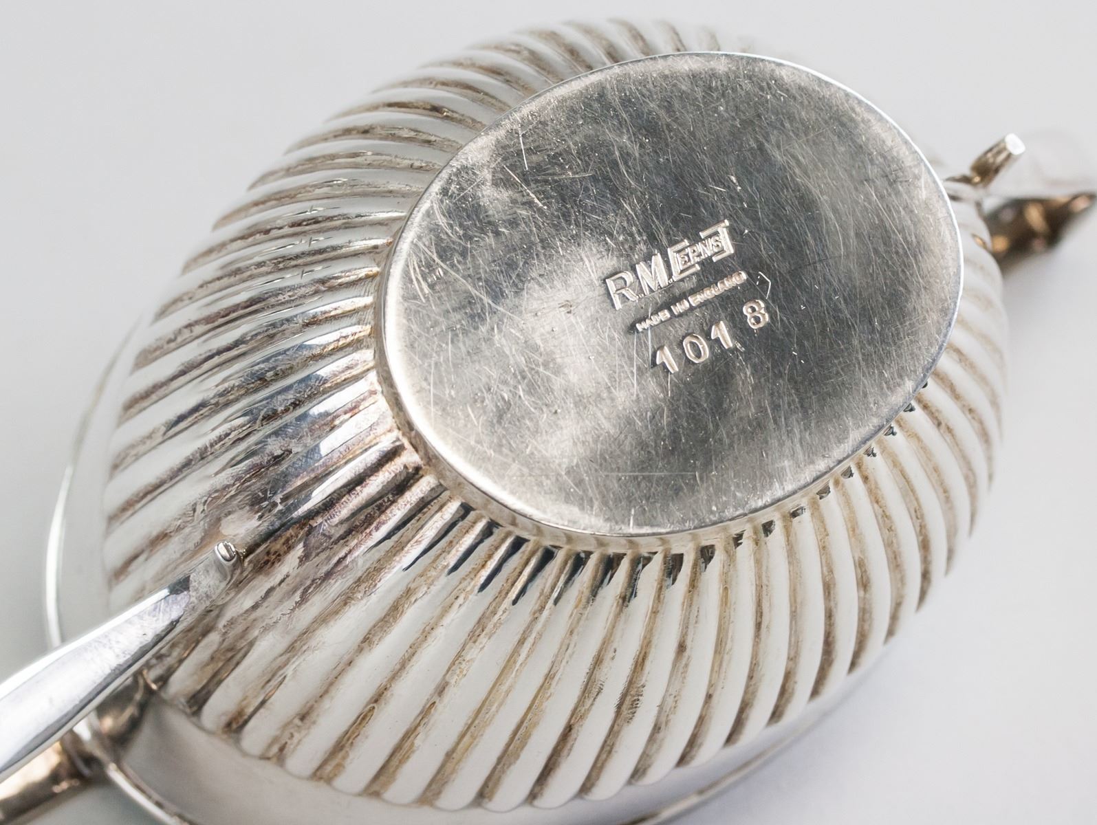 Teapot with cream jug and sugar bowl. Of silver-plate. Stamped with "R.M.[EPNS] MADE IN ENGLAND 1018" on base. 10 x 14 cm ~ 16 x 19 cm, 984 grams total.