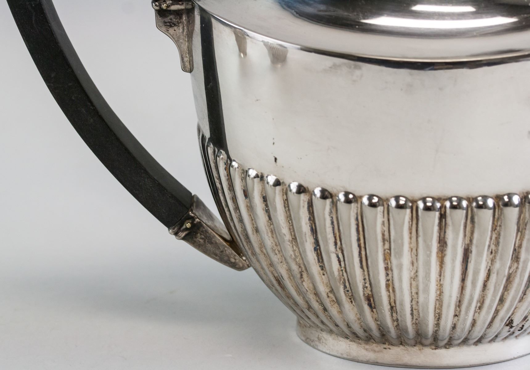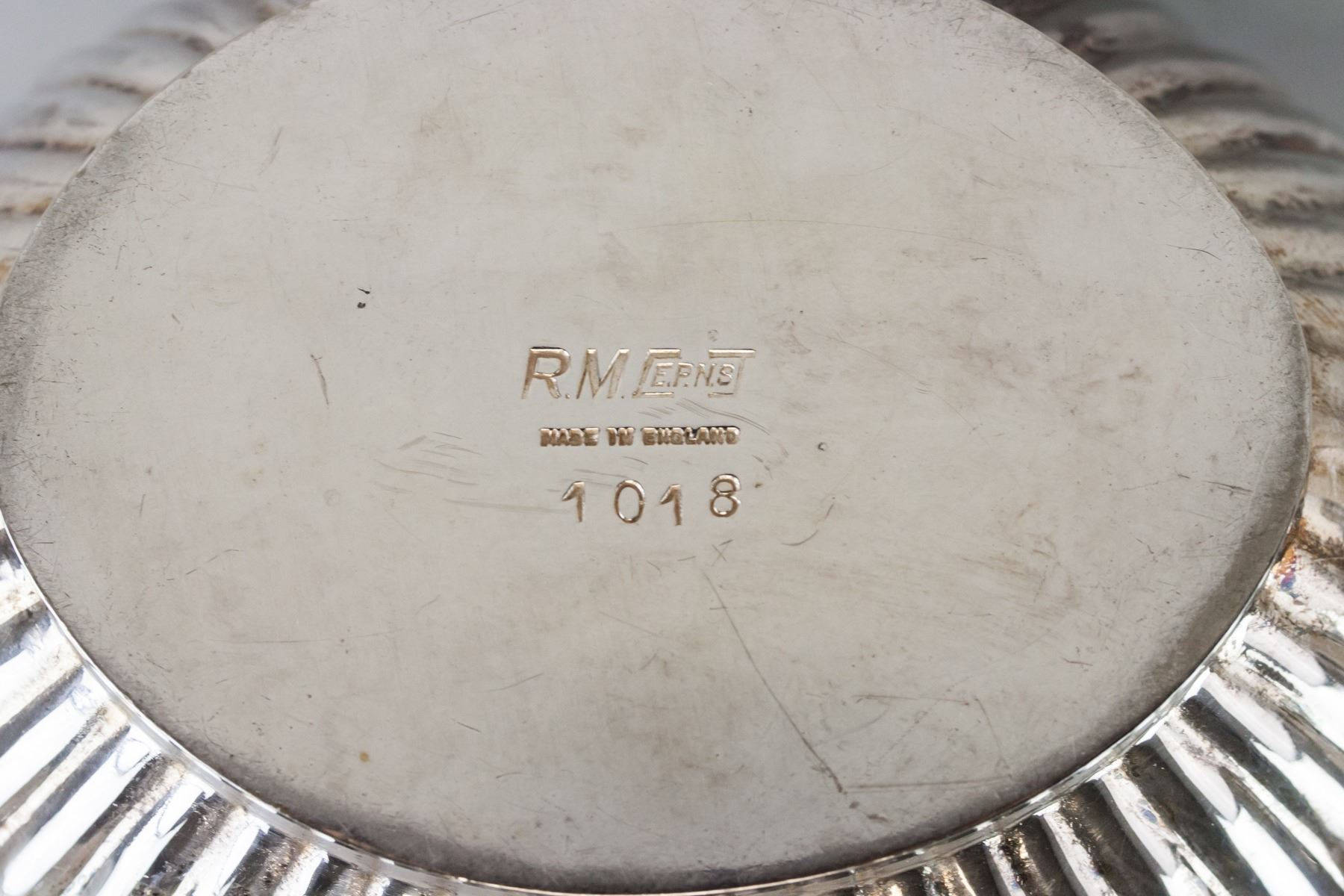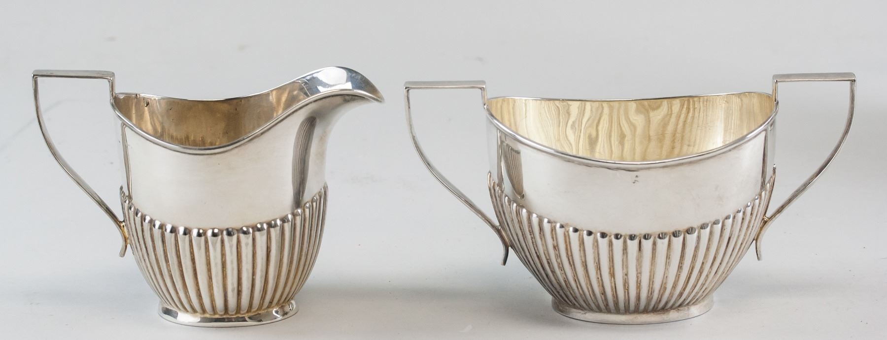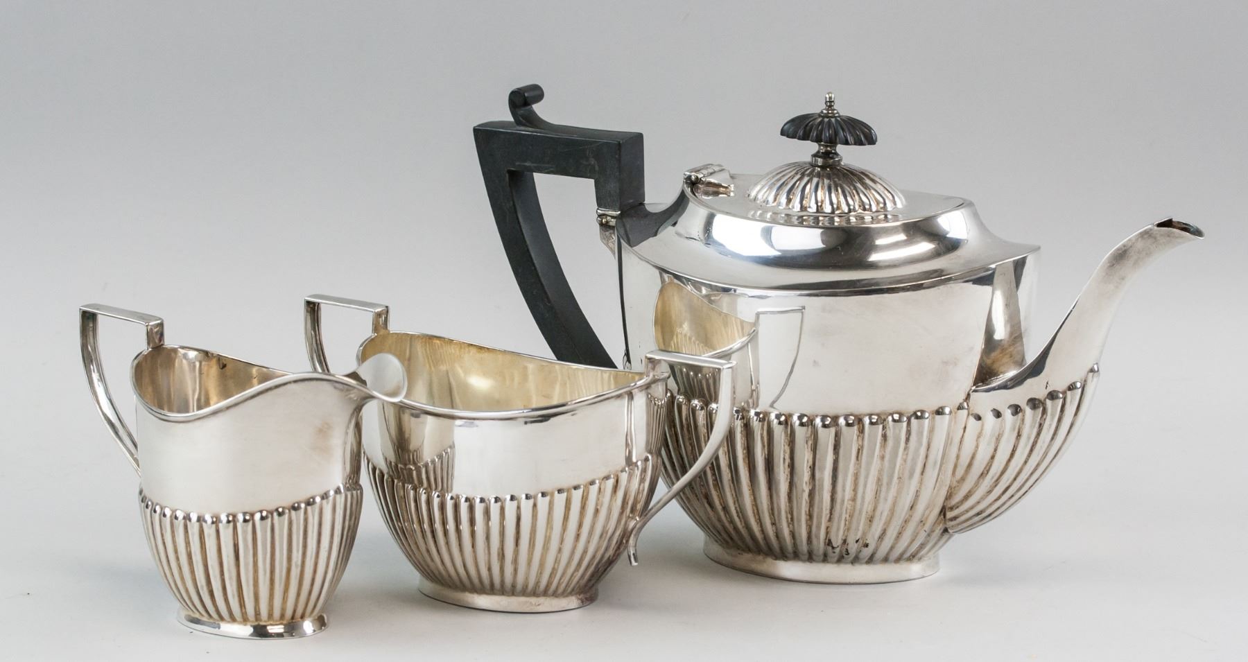 Teapot with cream jug and sugar bowl. Of silver-plate. Stamped with "R.M.[EPNS] MADE IN ENGLAND 1018" on base. 10 x 14 cm ~ 16 x 19 cm, 984 grams total.