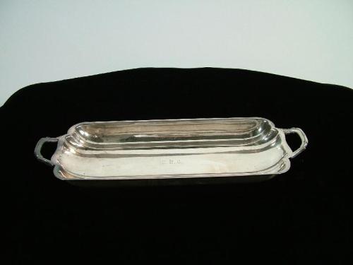 Silver plated tray with handles, stamped Briston Silver by Poole. 100 on bottom, monogrammed C.B.C. 1" by 14 1/2" by 5 1/4"; Silver plated creamer with floral base. Stamped Meriden B. Company, Meriden Britannia Quadruple Meriden, CT. 33 on base. 5" by 5 1/4" by 3"; Silver plate milk pitcher with high handle and feet, stamped MFD and plate by Reed & Barton. 2970 on base. 5" by 6" by 3 1/2"