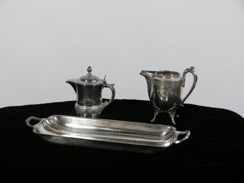 Silver Plated Tray with Handles, Creamer, and Milk Pitcher