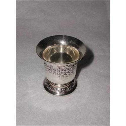C.1920 silver plated vase or cocktail pick holder has a beautiful floral wide design and smaller one on base. 2 3/8H X 2 3/8W. Excellent condition. No markings.