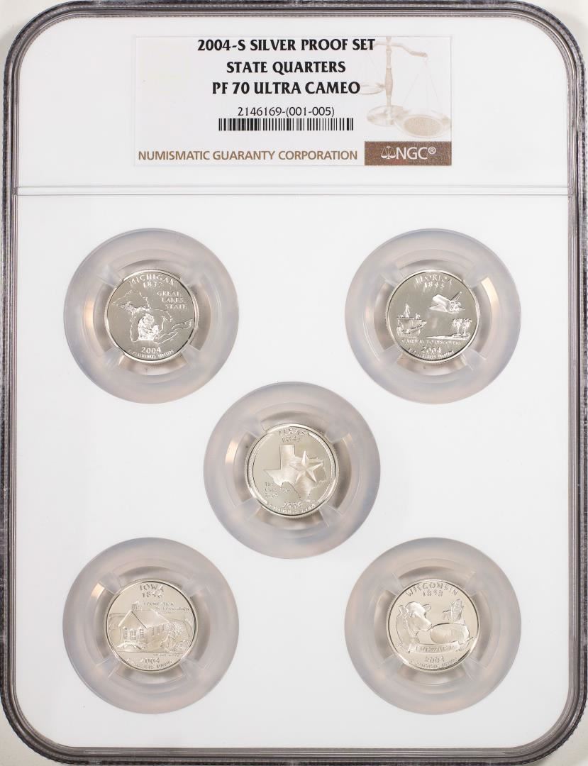 One Silver Proof Set of (5) 2004-S State Quarter Coins NGC PF70 Ultra Cameo. NGC Certified.