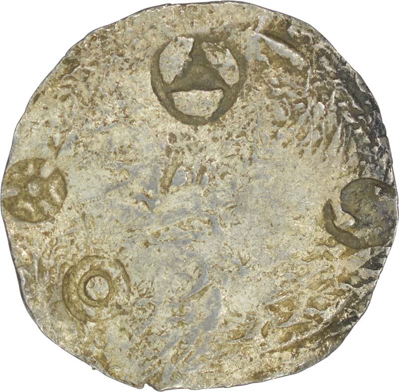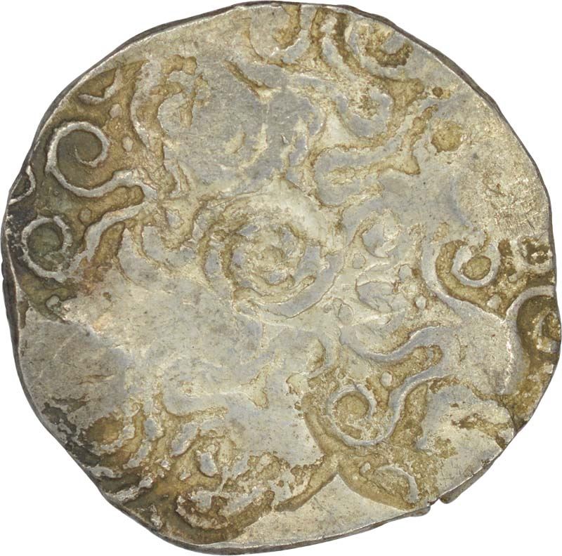 Punchmarked Coins, Panchala Janapada,(5th BC)Silver Vimshatika,Obv:coin depicts an octopus with spread tentacles above a cave, with three of its tentacles holding a horse a snake and a bird,Rev: uniface with some of sarrafmarks,broad flan, excellent and deep hammered,4.50g, 26.10mm,about very fine,Extremely Rare.