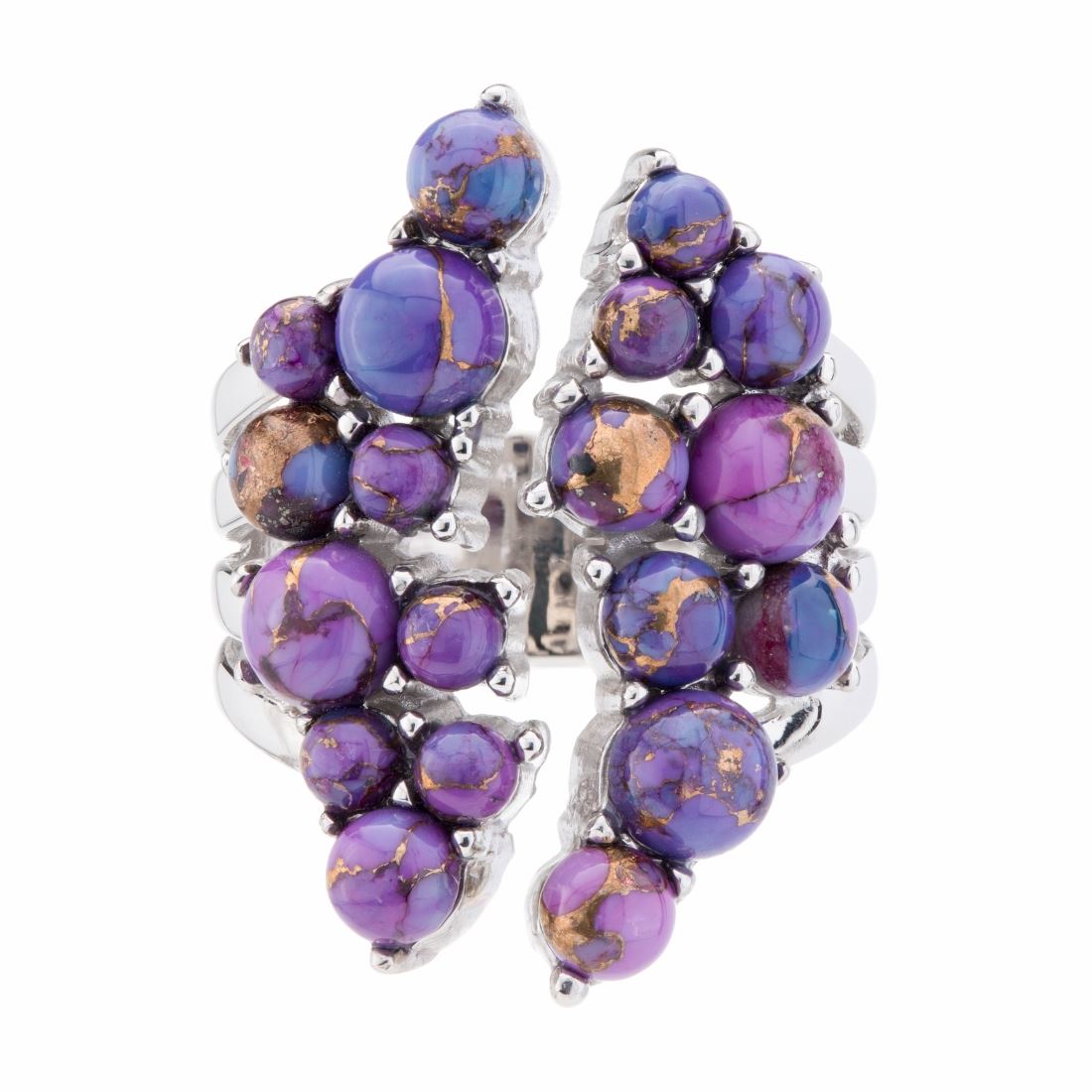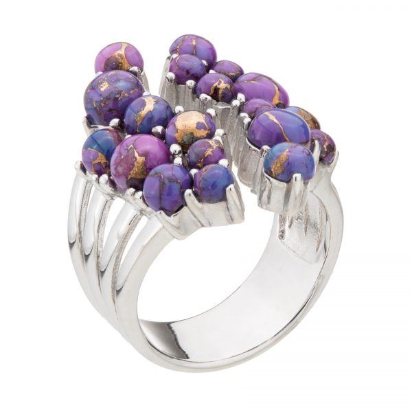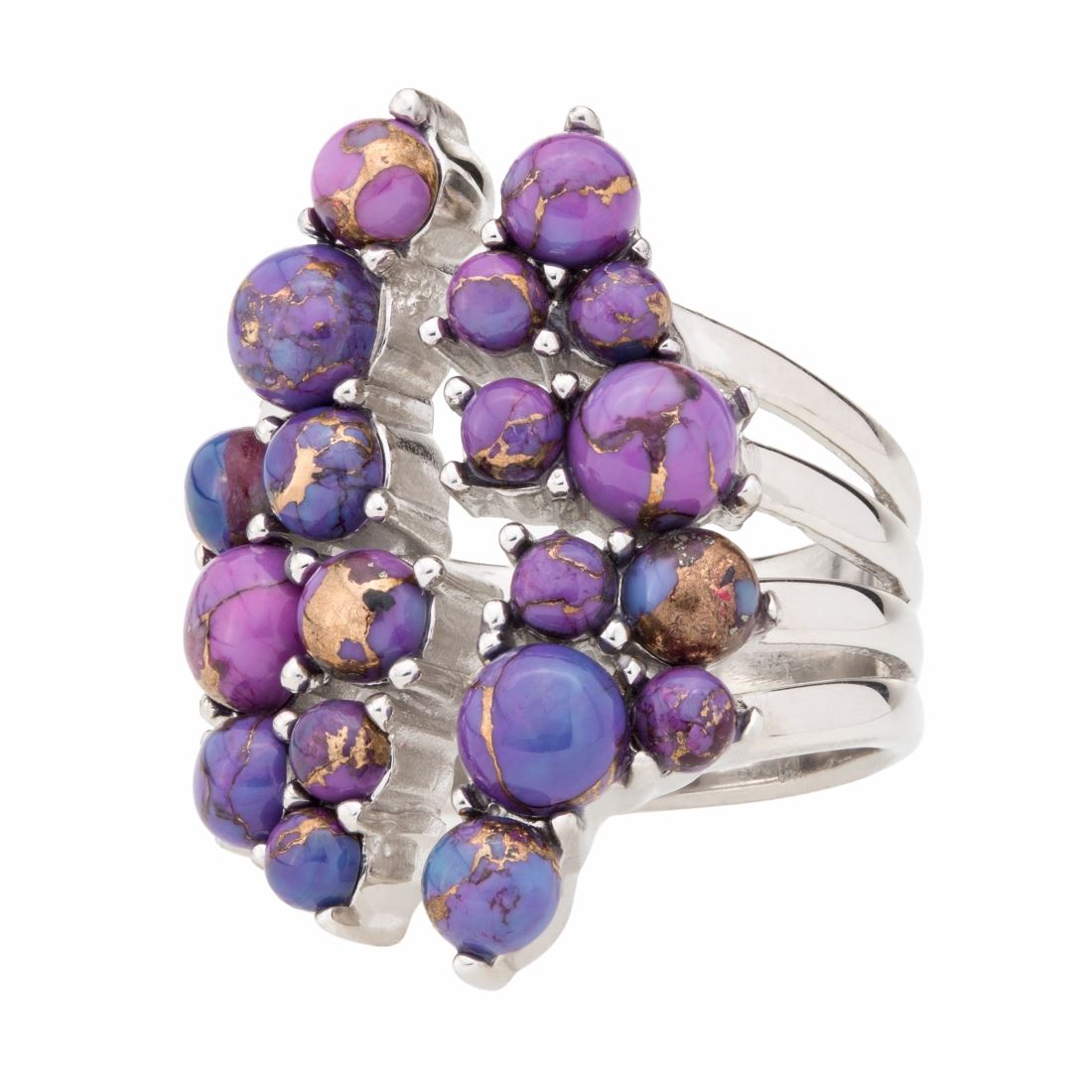 Brilliant Purple Mohave Turquoise cabochons artfully cluster together in a playful bubble like pattern evoking a light and flirty feel. Like a mohave desert canyon The golden matrix of the green mohave organically weaves amongs the vivid purple color that is sure to evoke wander and delite. When you think of bubbles, what do you imagine? Light, airy, fun. Right on. That's this ring to a tee. • Genuine Purple Mohave Turquoise