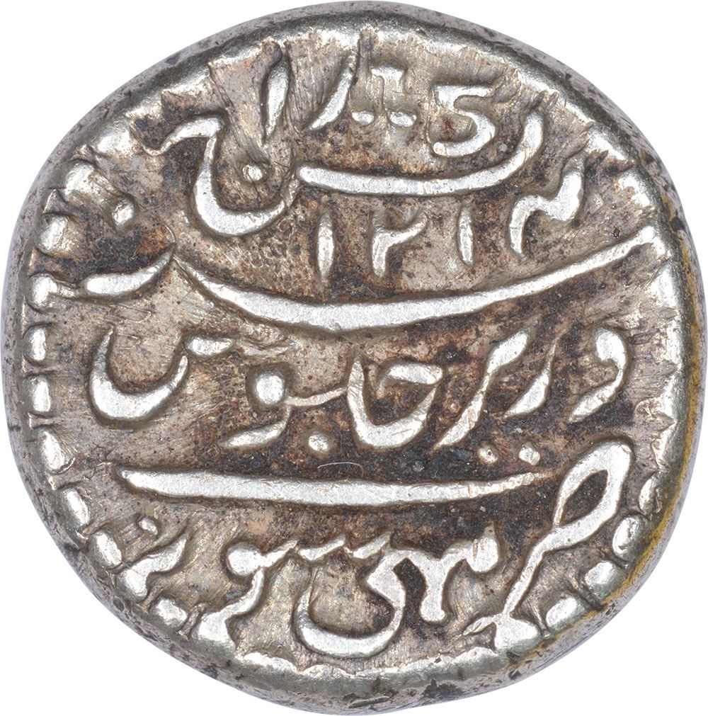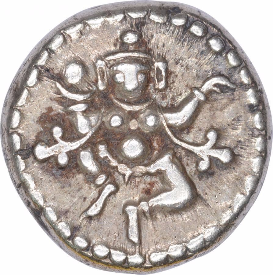 Mysore, Krishnaraja Wadiyar III, Mahisur(Mysore)Mint, Silver 1/4 Pavali (Rupee), AH 1214,Obv: dancing figure chamundi, Rev: kishanraj, sana julus zarb2.85g, 13.33mm, (KMC # 202), about extremely fine, Scarce.