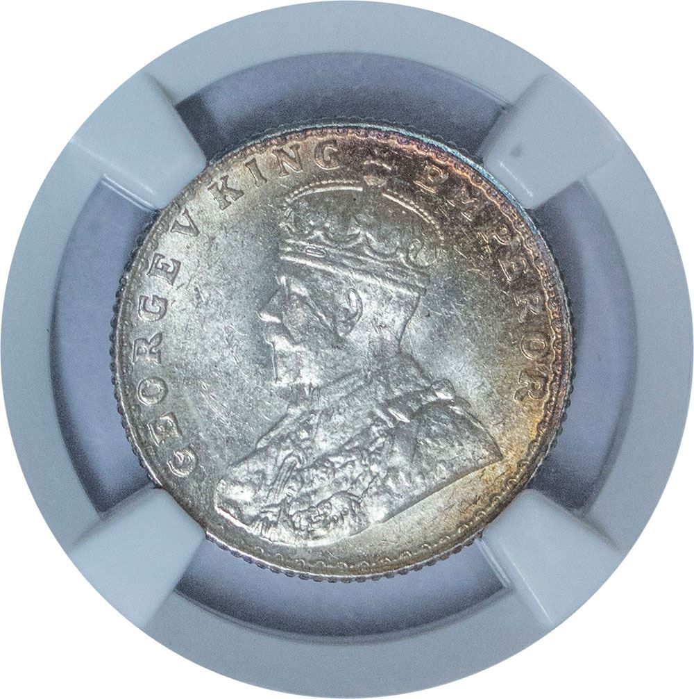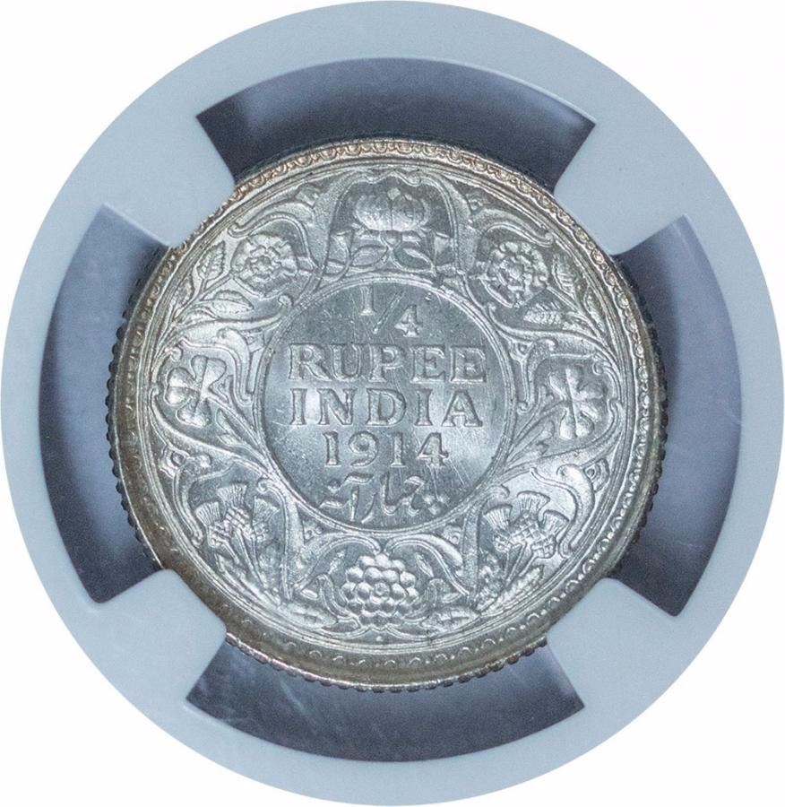 1914,King George V,Silver 1/4 Rupee,Bombay Mint, Dot,(PR # 573),graded slabbed by NGC as MS 63, Rare.