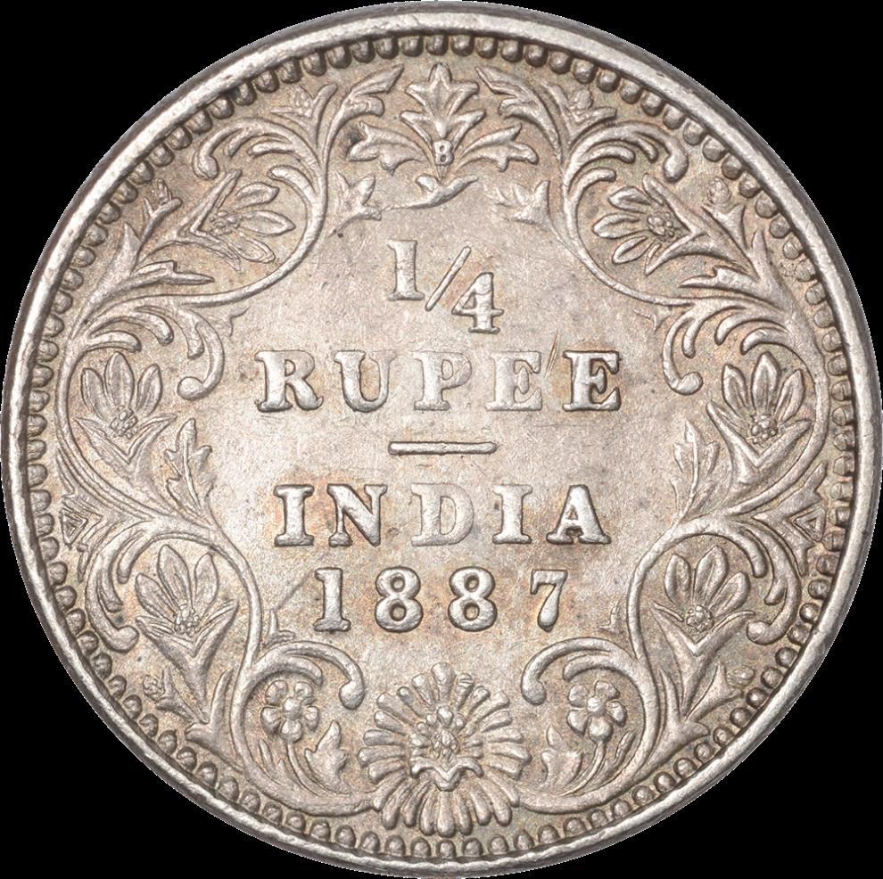 Silver Quarter Rupee Coin of Victoria Empress of Bombay Mint of 1887.